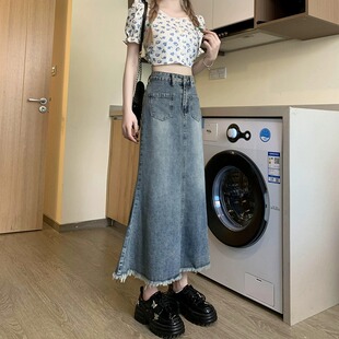 鱼尾裙 高腰小个子显瘦毛边中长款 复古牛仔半身裙女2024年夏季 新款