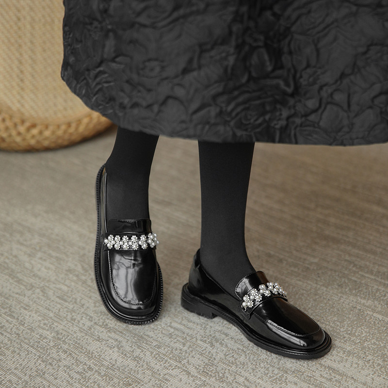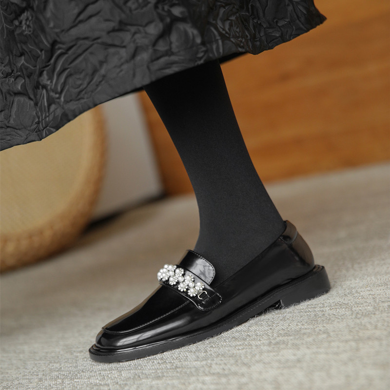 一脚蹬乐福鞋 2025年春季 女英伦风珍珠单鞋 方头真皮平底小皮鞋 新款