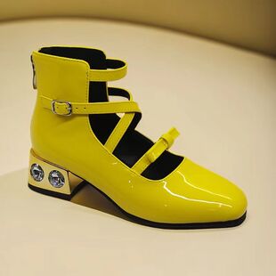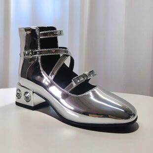 模特走秀比赛小黑鞋 金色银色漆皮水钻宝石粗跟高帮蝴蝶结单鞋 小码