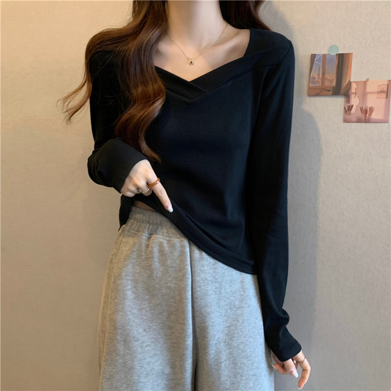 内搭修身 韩版 显瘦上衣服 T恤女春秋德绒磨毛打底衫 纯色简约V领长袖