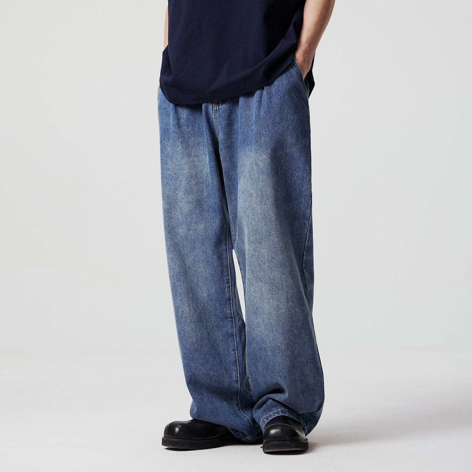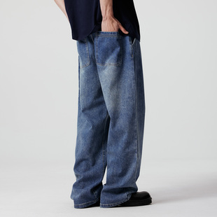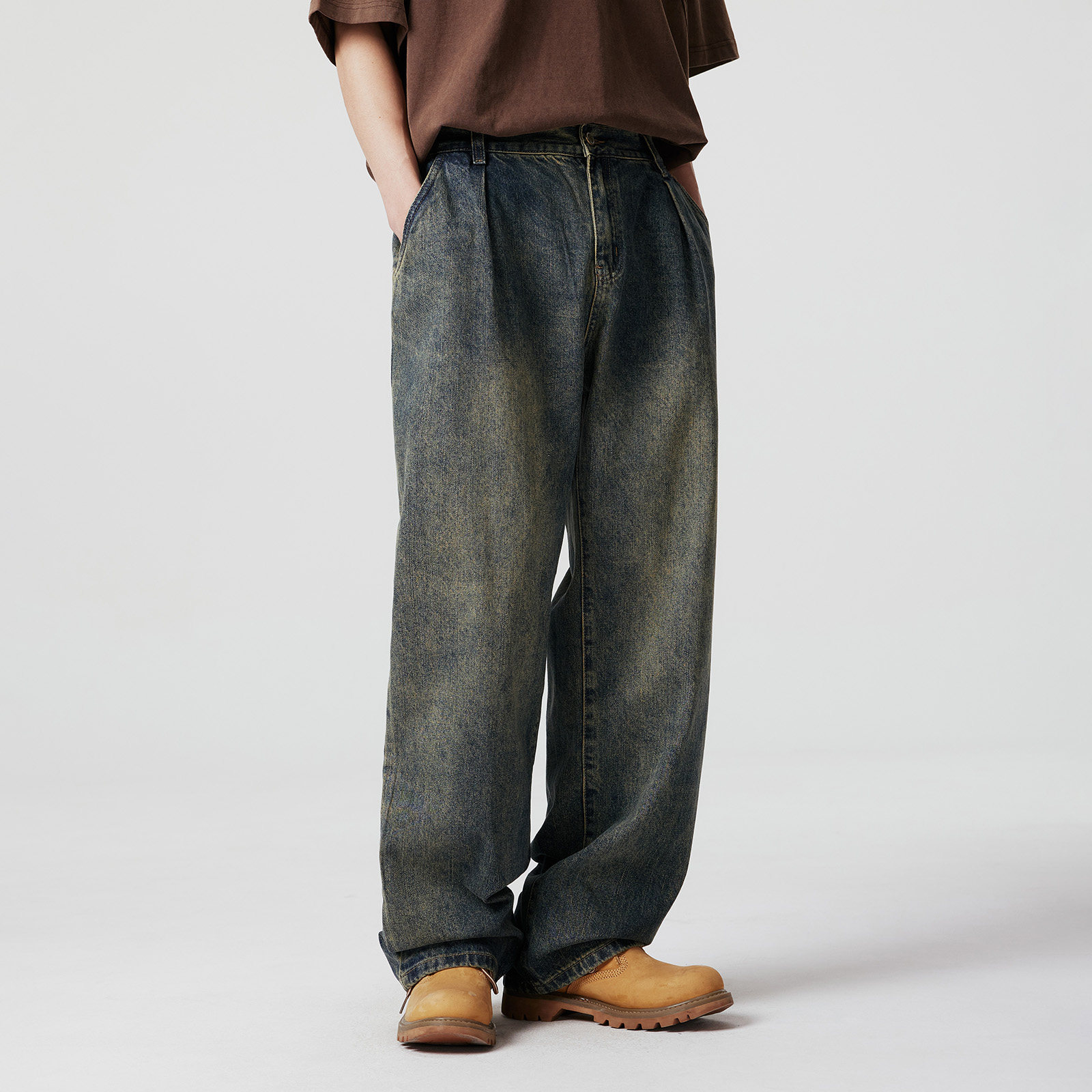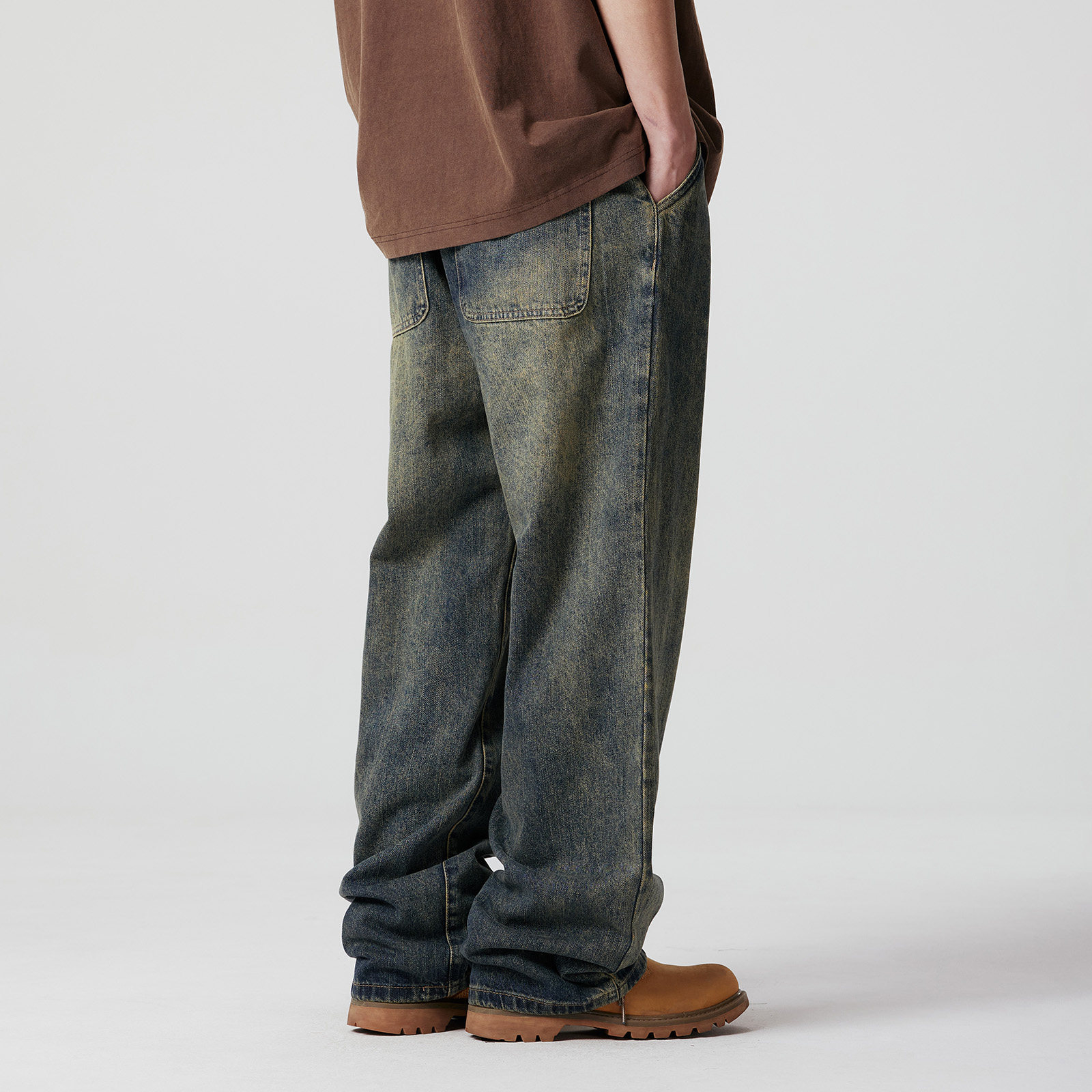 男宽松冬季 潮牌加绒裤 新款 美式 子 直筒裤 做旧复古水洗黄泥染牛仔裤