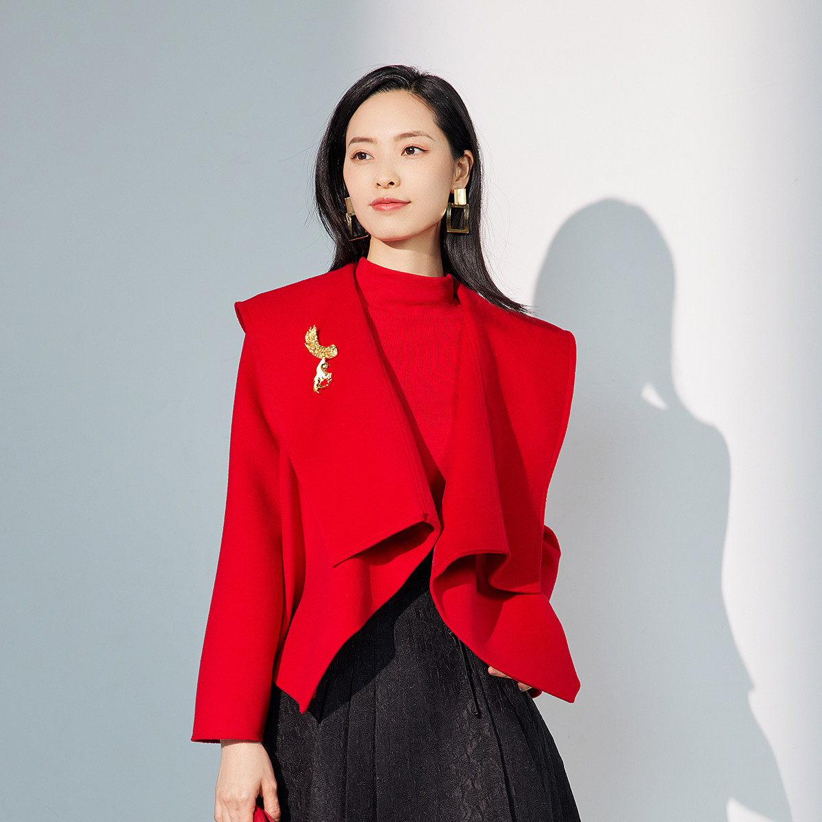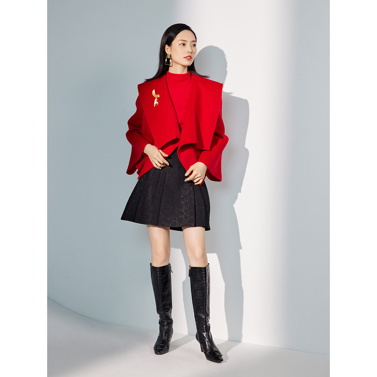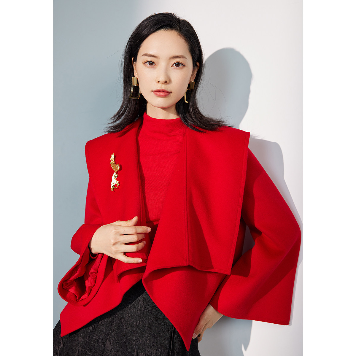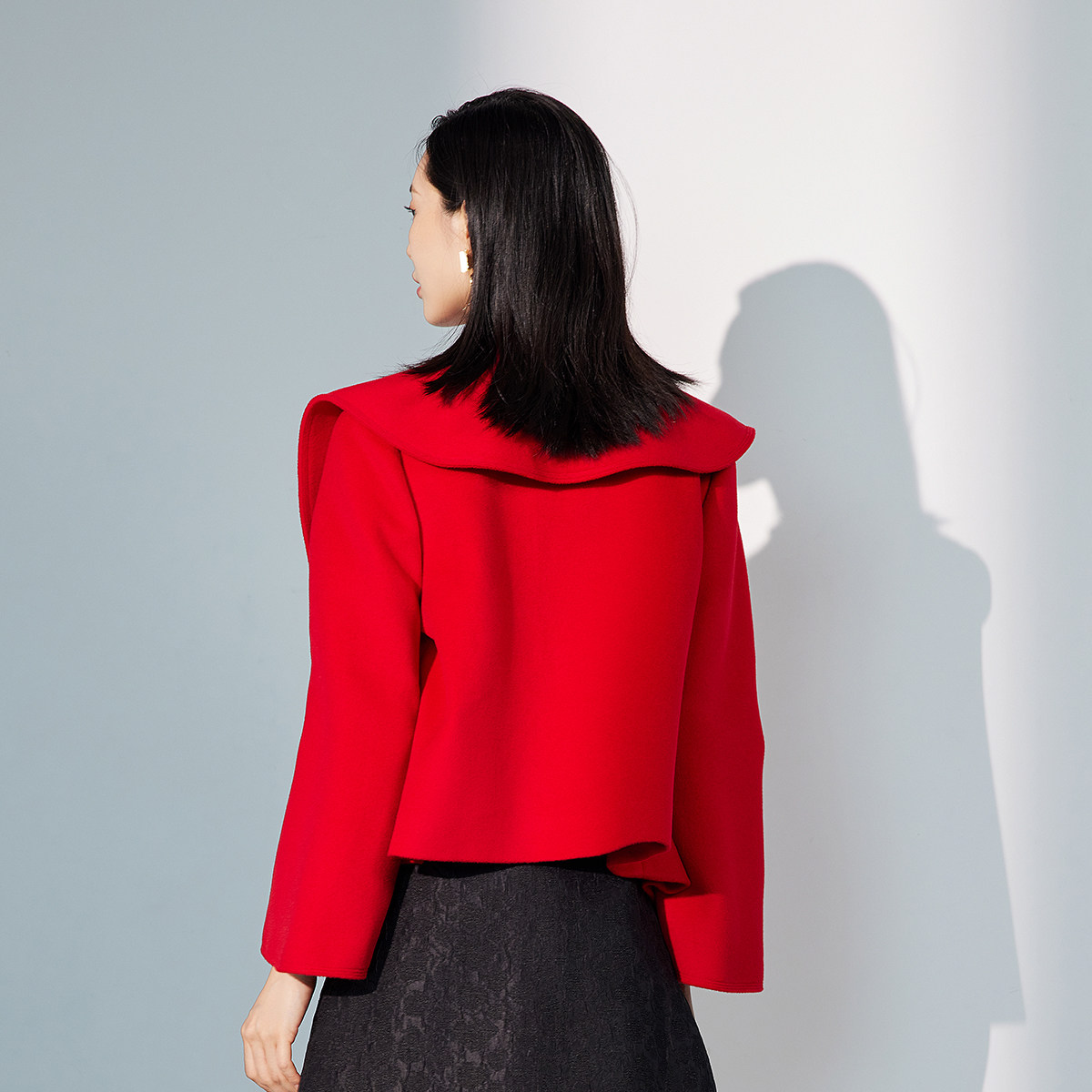 冬装 粉蓝衣橱商场同款 短大衣 大叠领设计绵羊毛红外套 斗篷式
