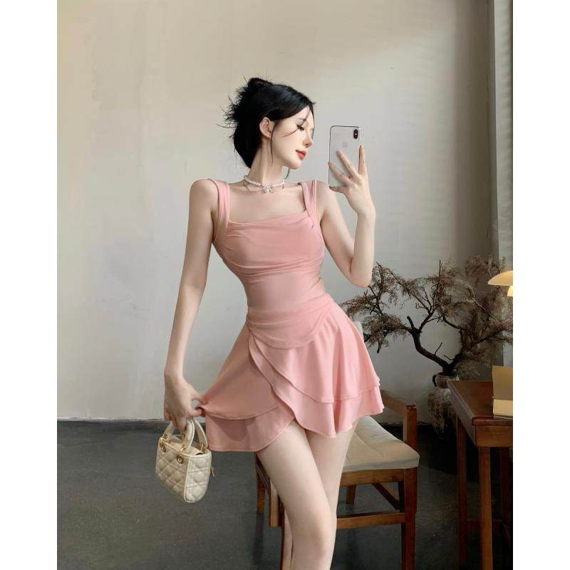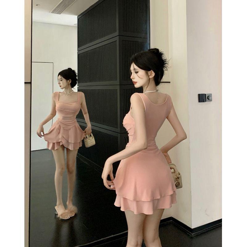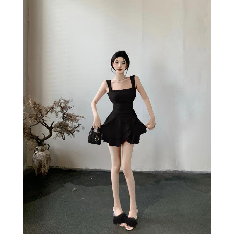韩系温柔风纯欲甜辣风小个子方领收腰显瘦背心 夏 短裙两件套裙装