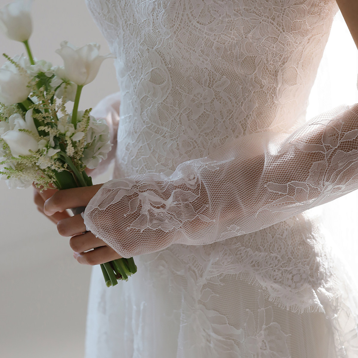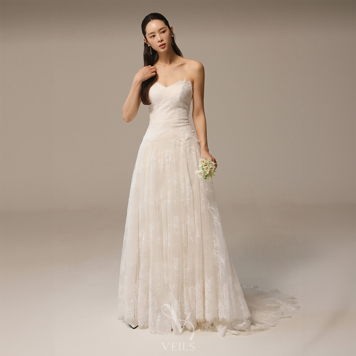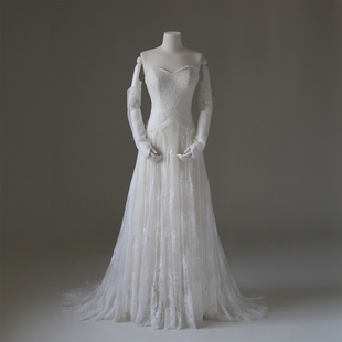 蕾丝抹胸小拖尾定制新娘婚纱轻纱套装 Veils设计师款 复古气质法式