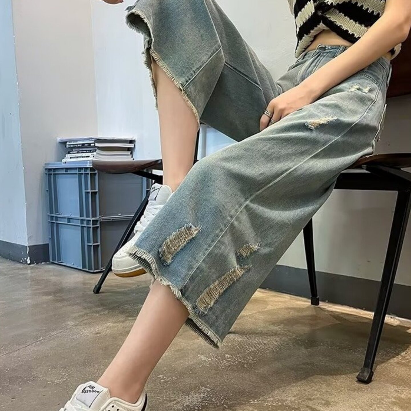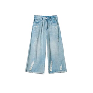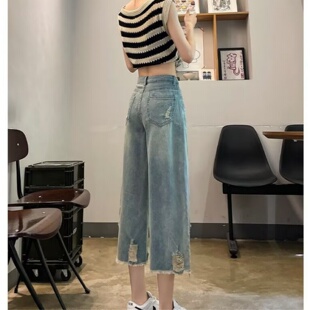 直筒阔腿裤 七分裤 潮 女高腰宽松显瘦毛边裤 2025春夏复古破洞牛仔裤