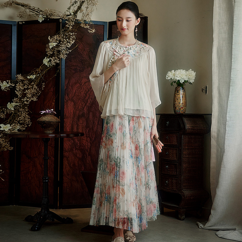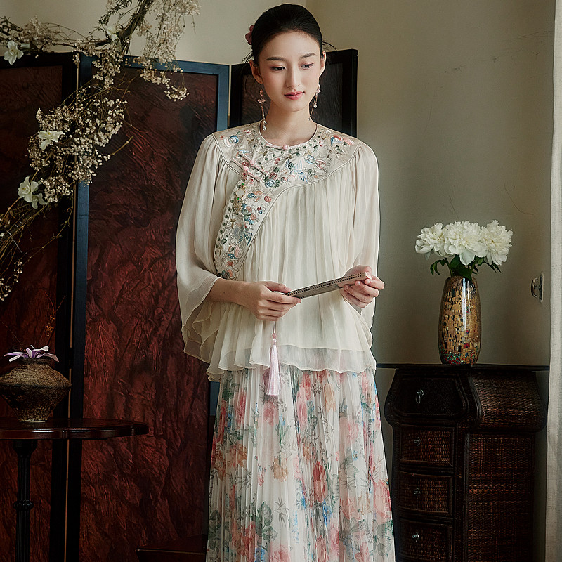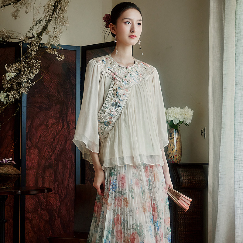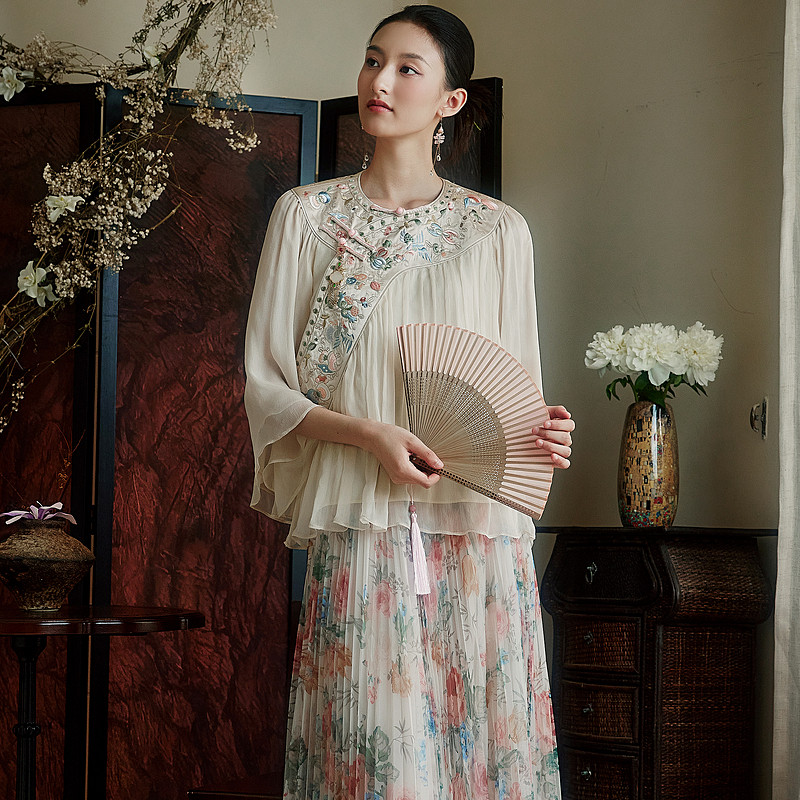 压褶唐装 陌遇 中式 中国风改良100%桑蚕丝刺绣汉清衬衫 上衣 晴岚