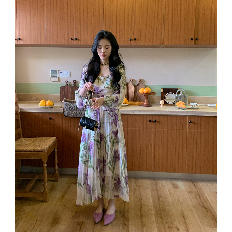 露背度假雪纺裙 收腰显瘦法式 ZHUYIYI 方领紫色碎花连衣裙女春长袖