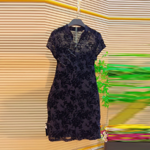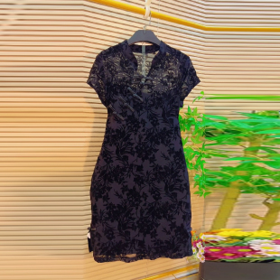 复古风洋气显瘦连衣裙 法式 加肥立领斜盘扣花朵蕾丝旗袍裙大码 女装