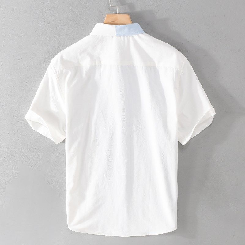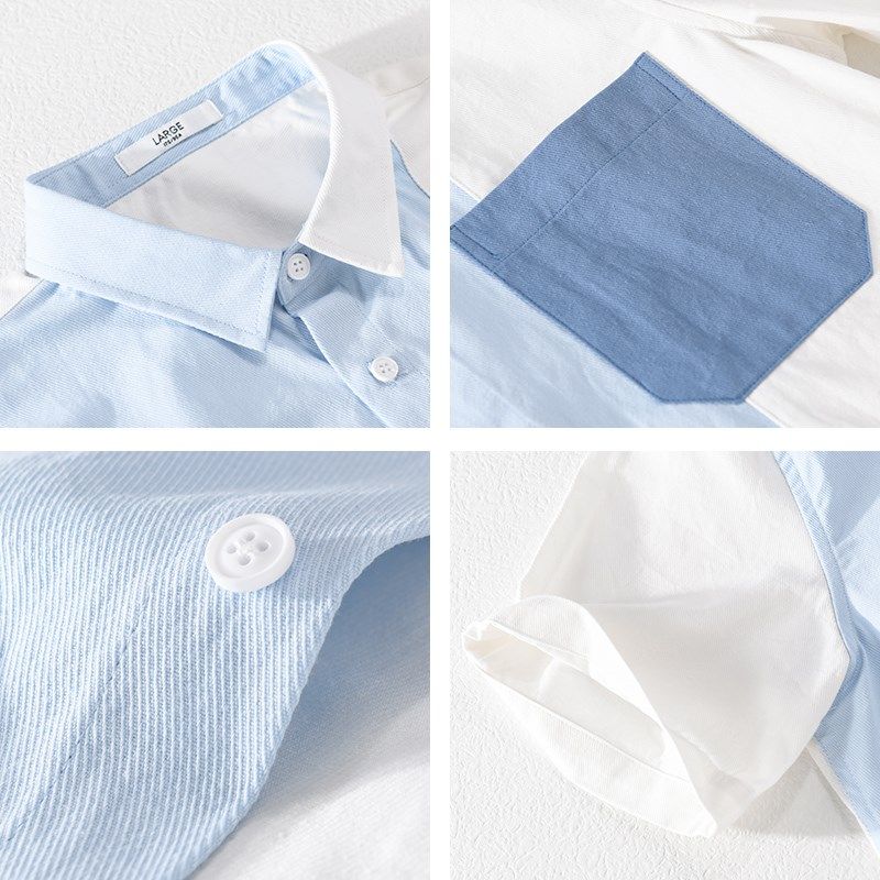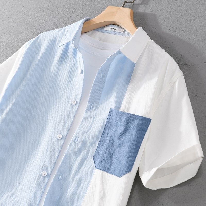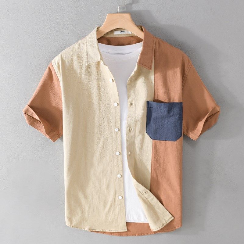 衬衣男薄款 夏季 男日系拼接纯棉半袖 衬衫 休闲上衣 潮牌复古拼色短袖