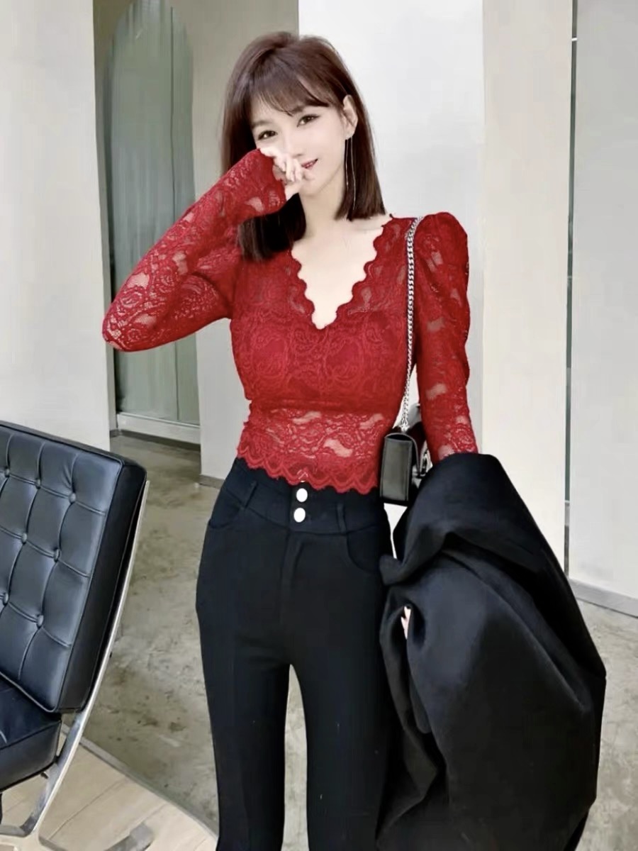 V领镂空蕾丝显瘦打底衫 卡卡女装 法式 韩版 上衣带胸垫 官方旗舰正品