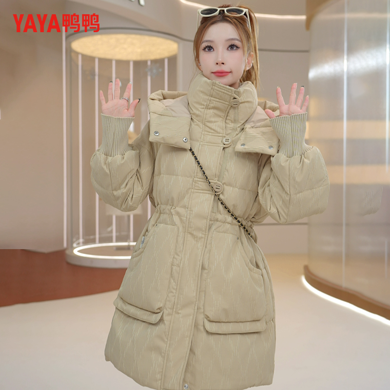 时尚 纯色中长款 潮流百搭连帽保暖外套 冬季 鸭鸭羽绒服女2025新款