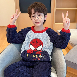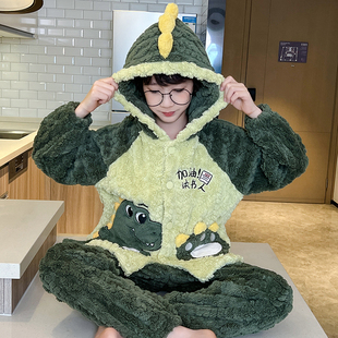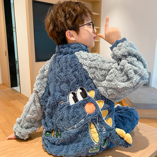 儿童睡衣男孩2025新款 秋冬珊瑚绒卡通恐龙加绒保暖法兰绒男童套装