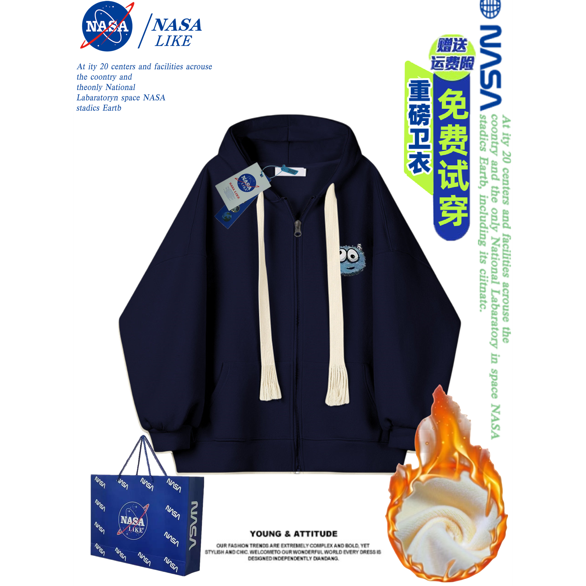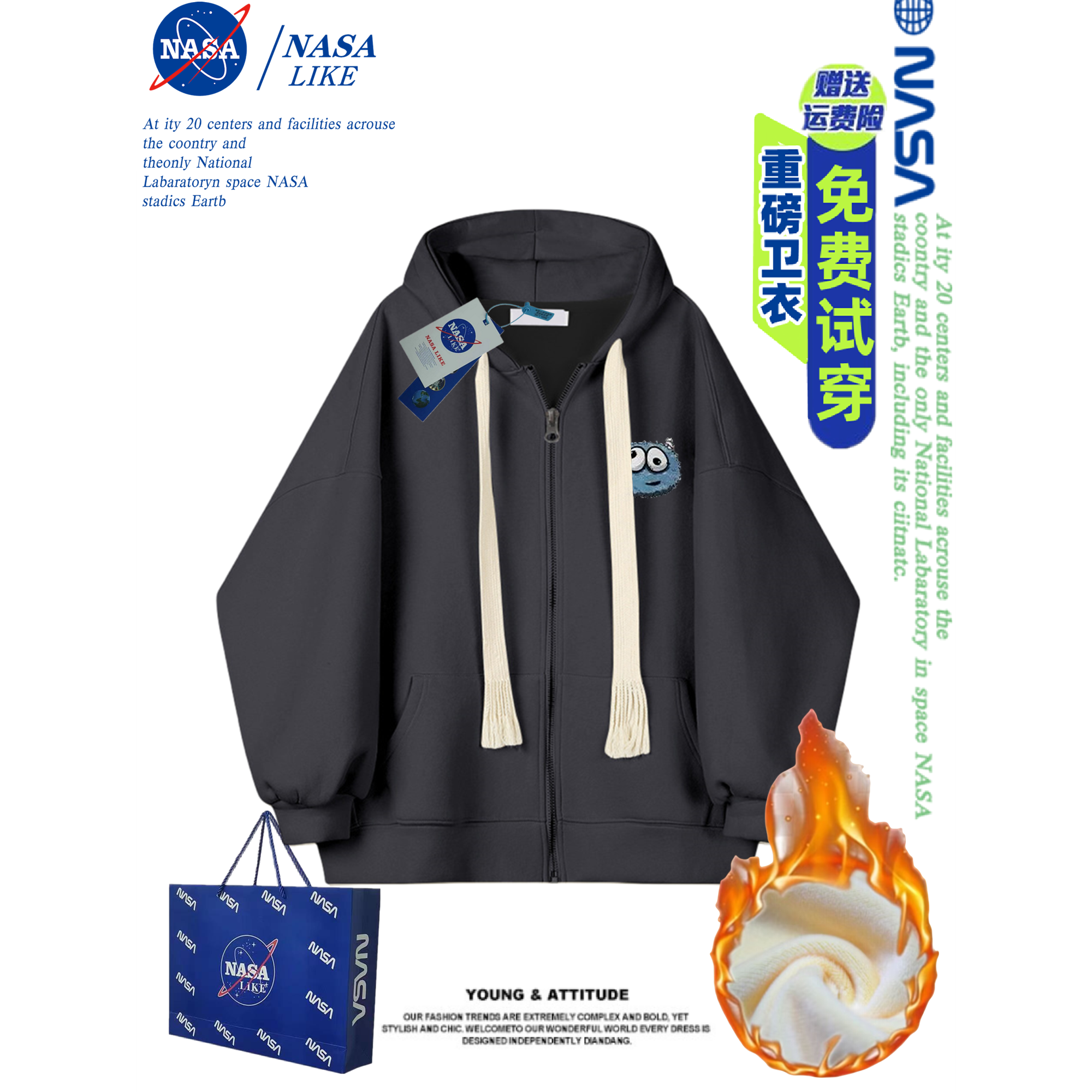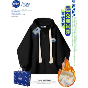 拉链休闲百搭卫衣外套情侣装 开衫 重磅男女同款 NASA加绒加厚秋冬季