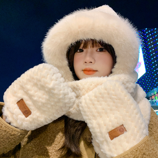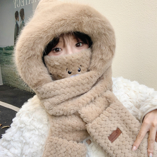 冬天小熊帽子女秋冬三件套冬季 可爱毛绒连帽围巾一体保暖手套围脖