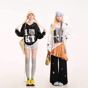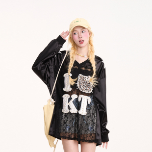 上衣 设计感宽松罩衫 NERESUM豹纹Kitty猫蕾丝镂空长袖 T恤女美式