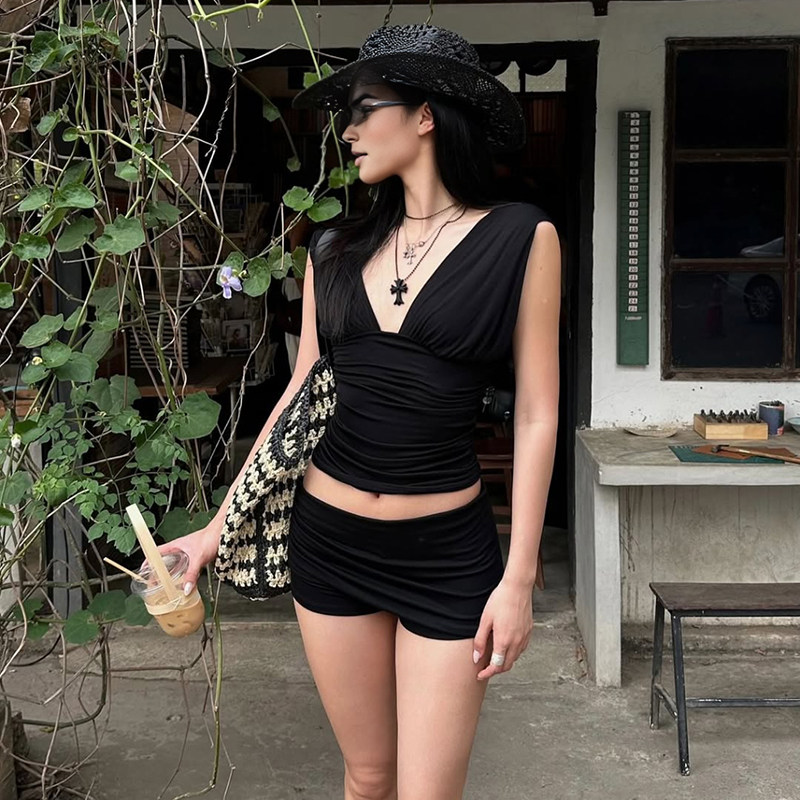 两件套女 背心褶皱紧身短裤 怪诞女孩 侘寂风性感辣妹黑色V领无袖