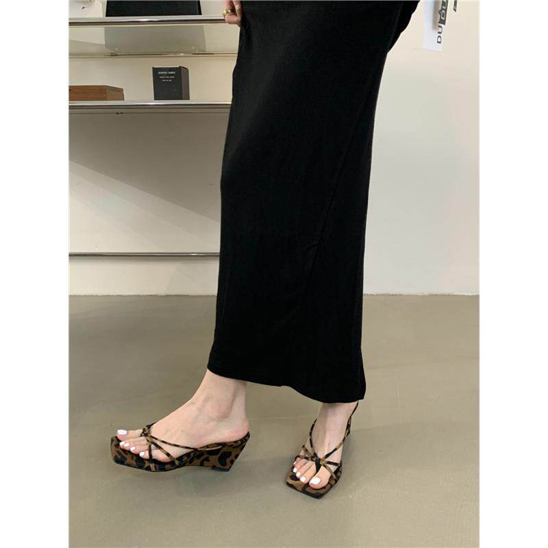 凉拖豹纹法凉鞋 露趾坡跟夹脚人字拖鞋 高跟法式 子外穿2025夏季 女鞋