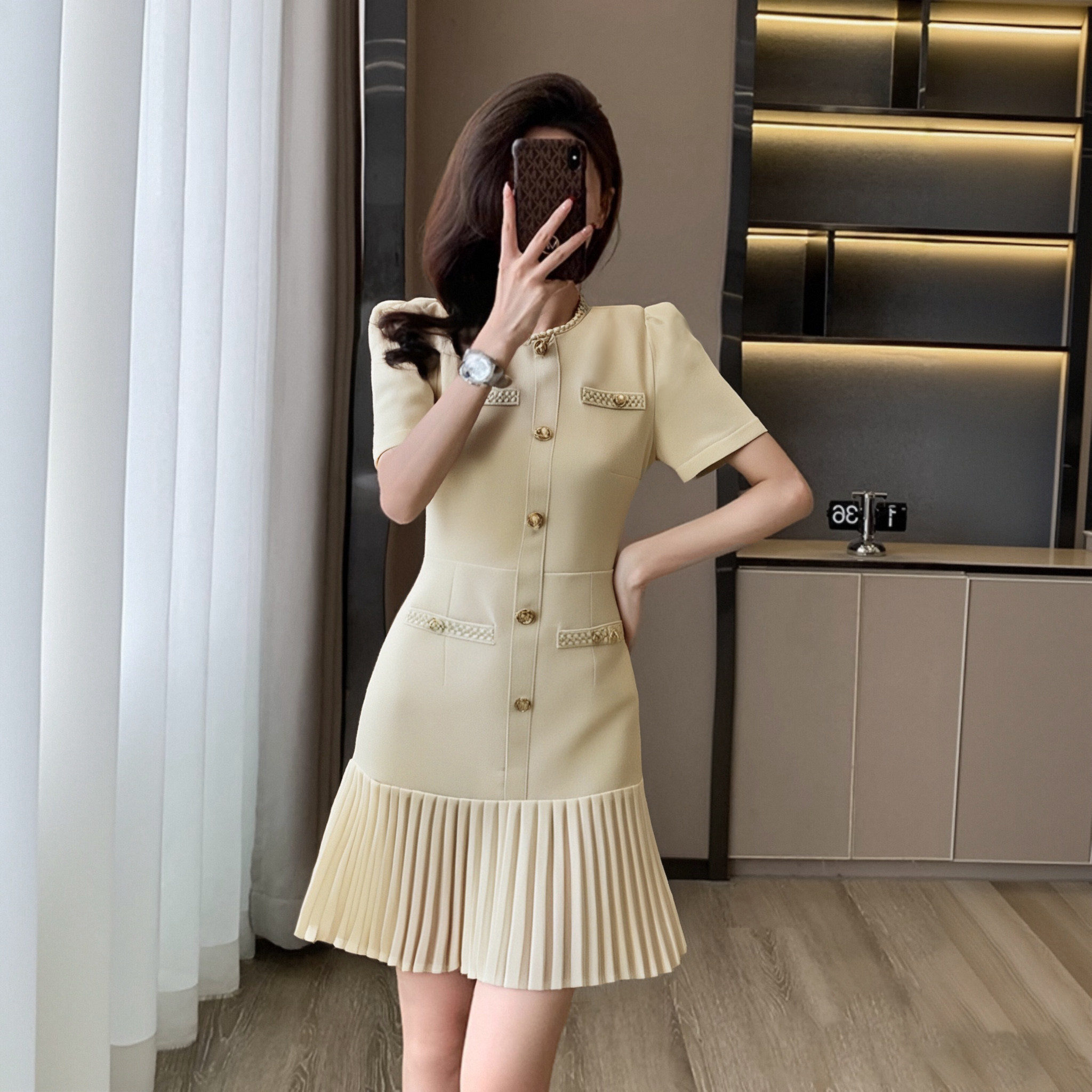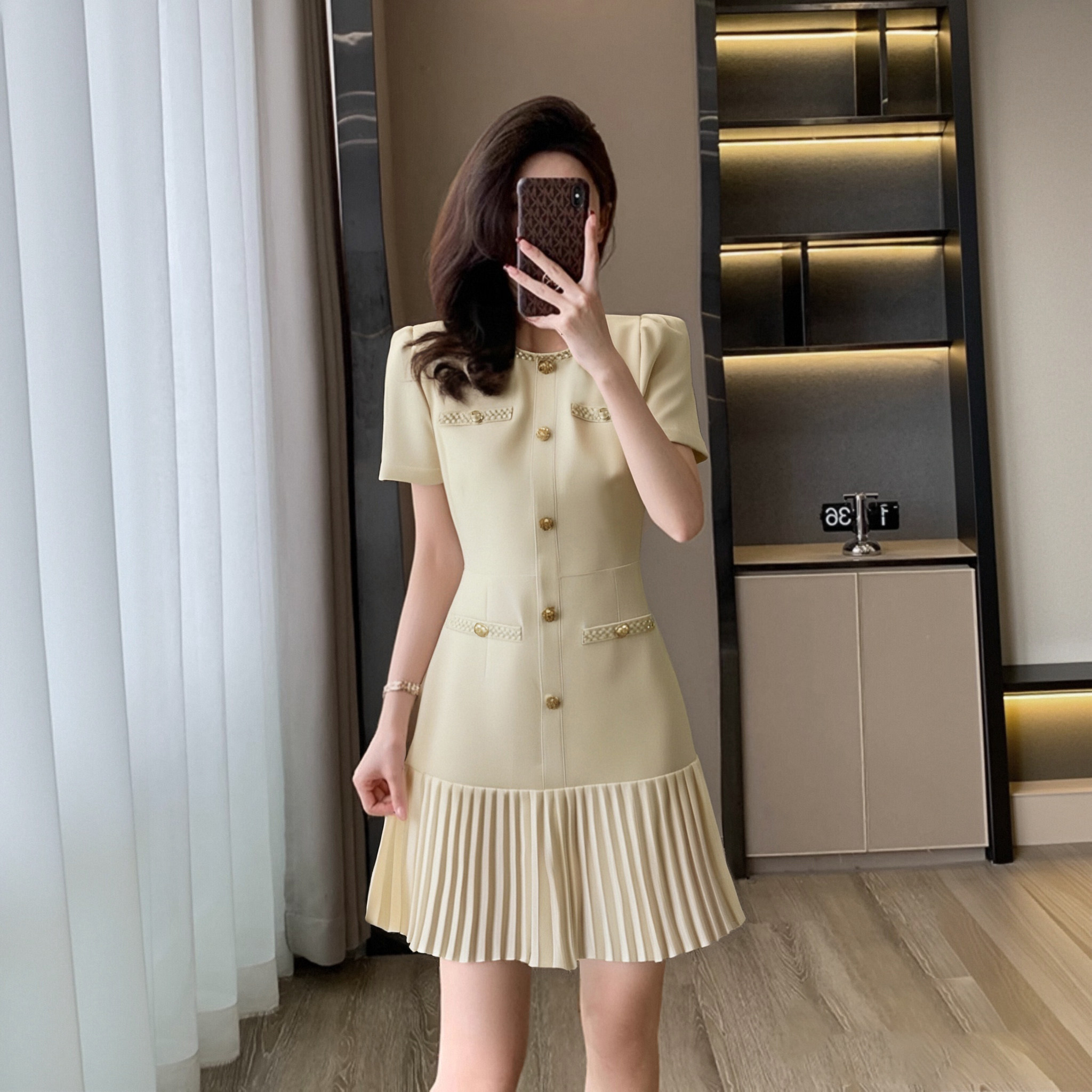 有里布法式 连衣裙女夏富家千金感轻奢气质收腰设计百褶裙D1581A