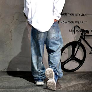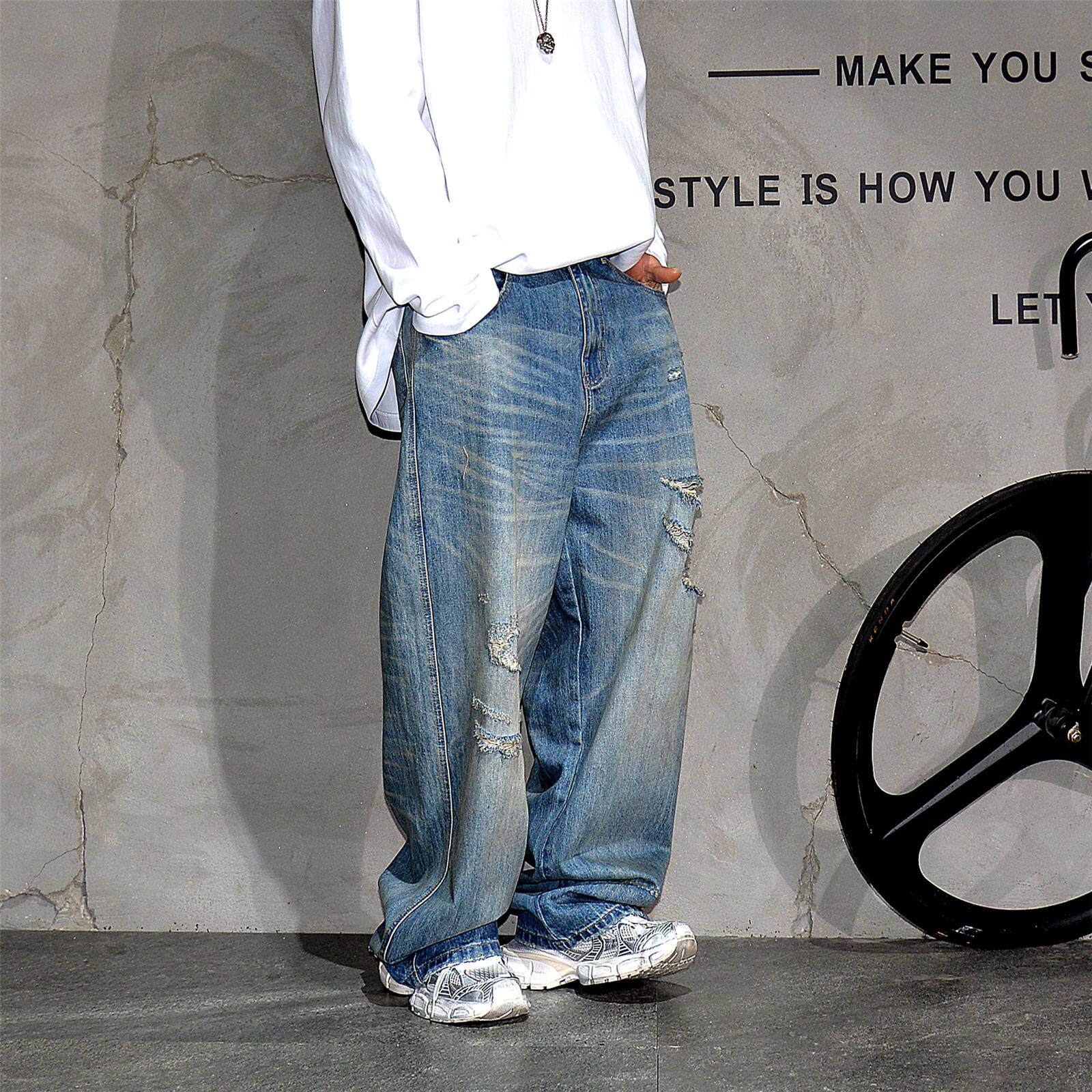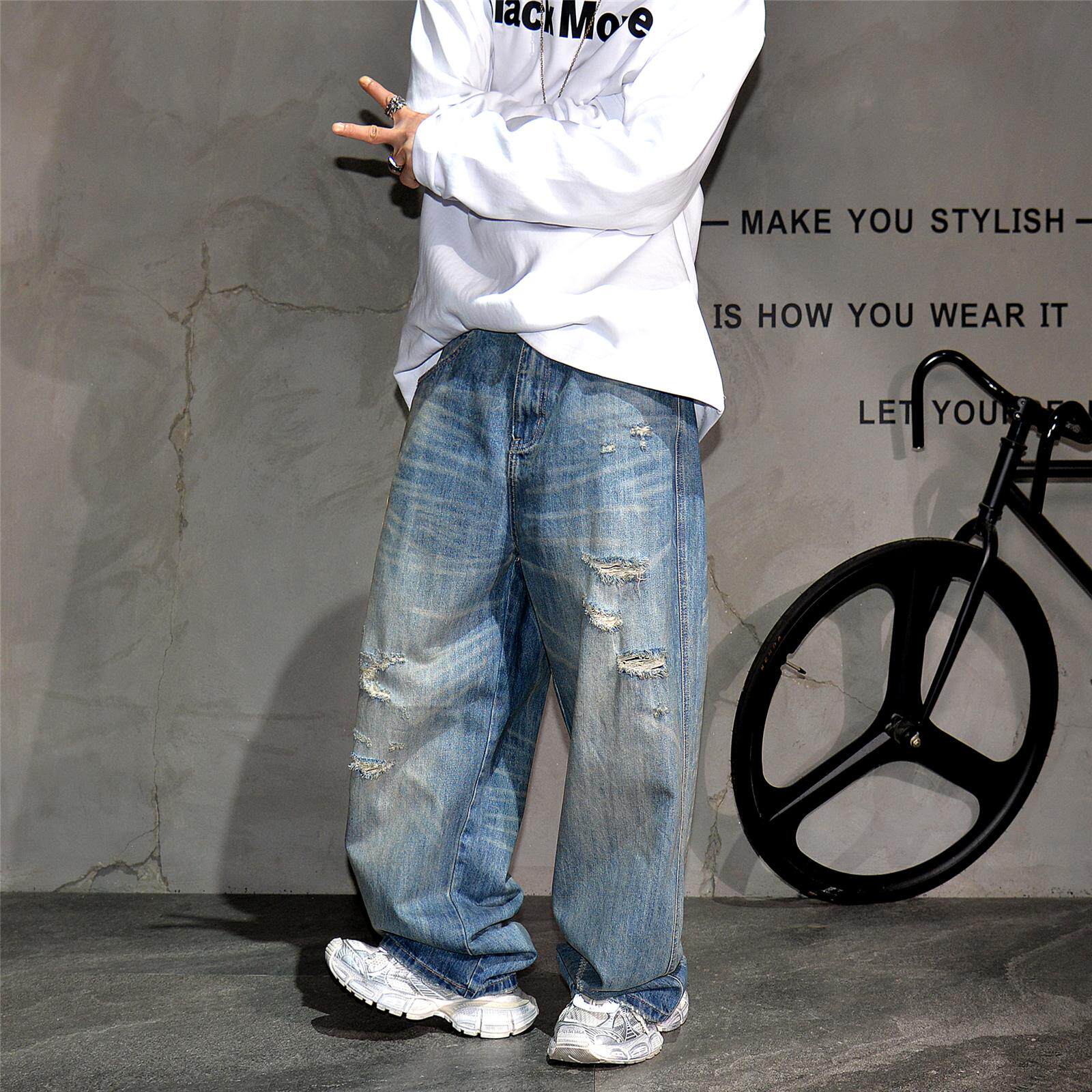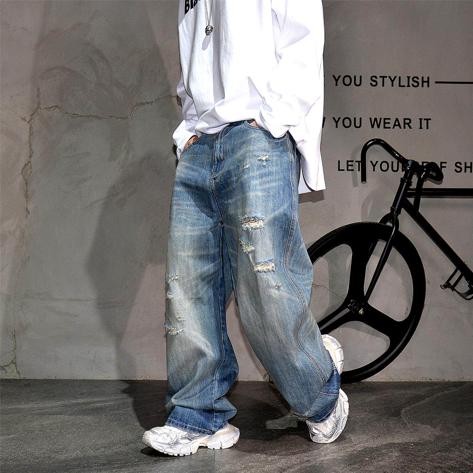 乞丐长裤 男潮牌痞帅宽松直筒大码 复古水洗做旧阔腿破洞牛仔裤 美式