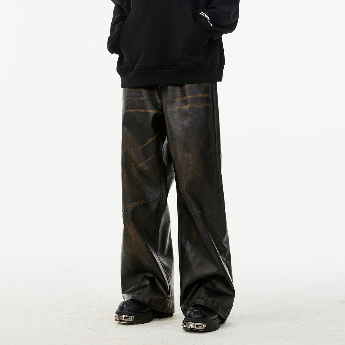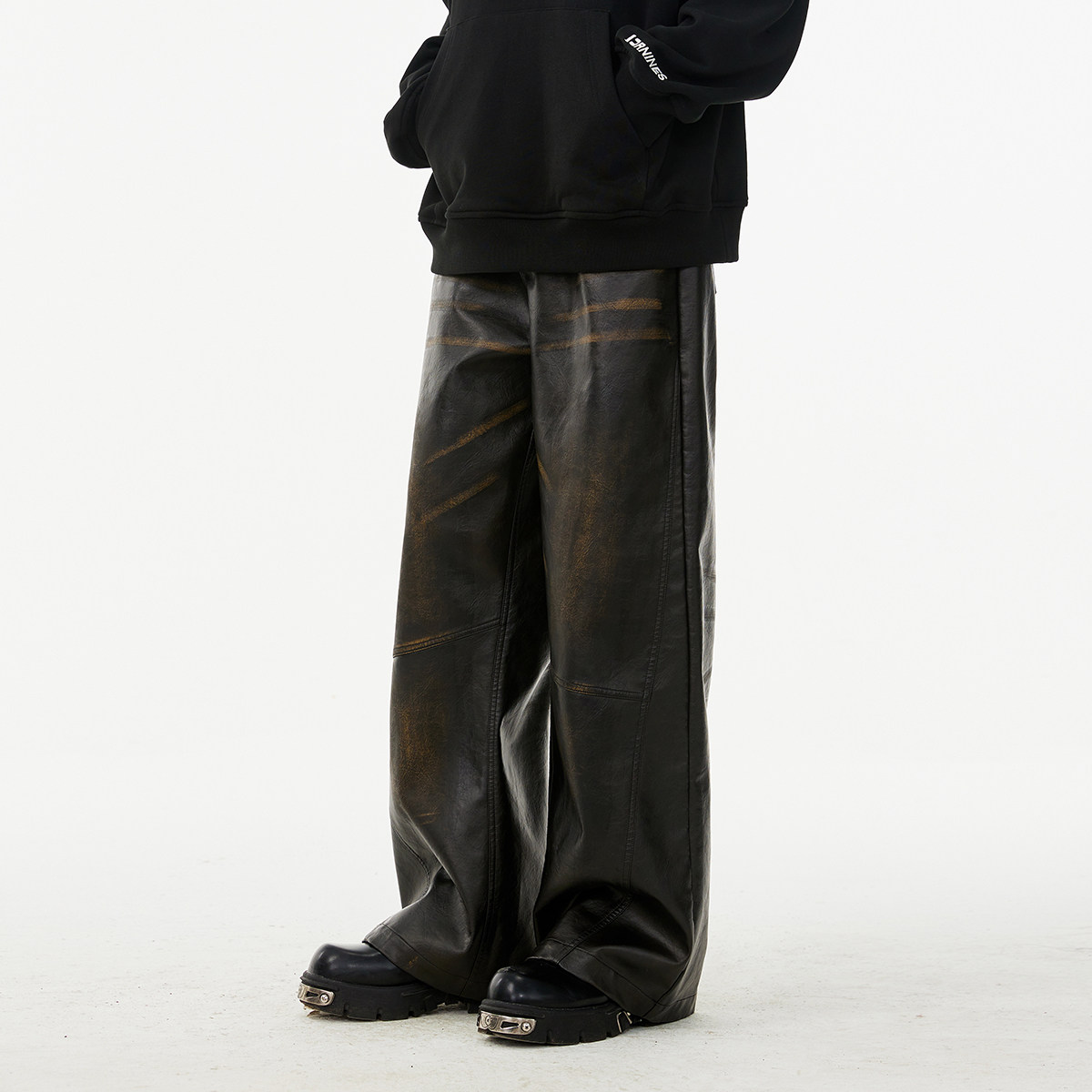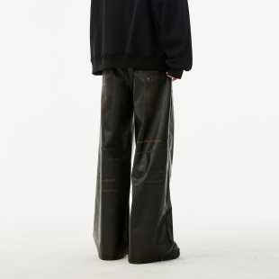 高街复古直筒休闲长裤 FORNINES立体钢印擦色阔腿皮裤 男女潮牌美式