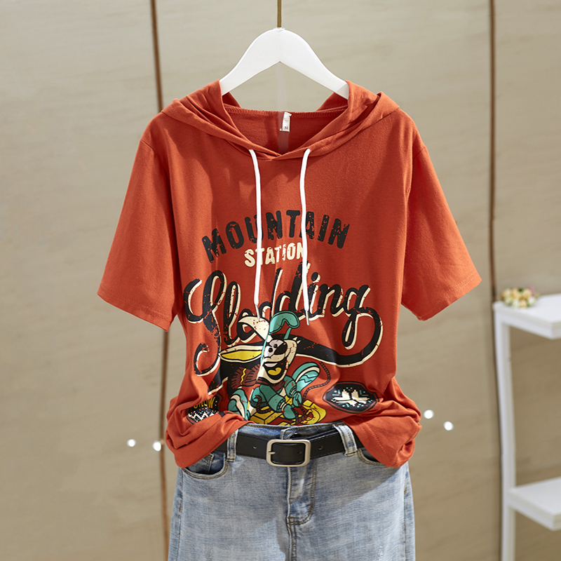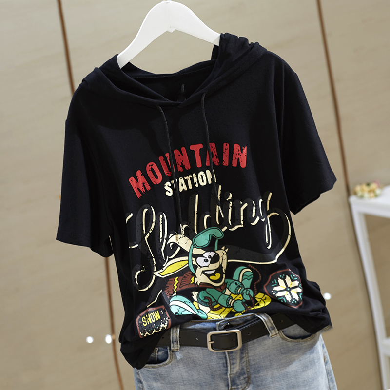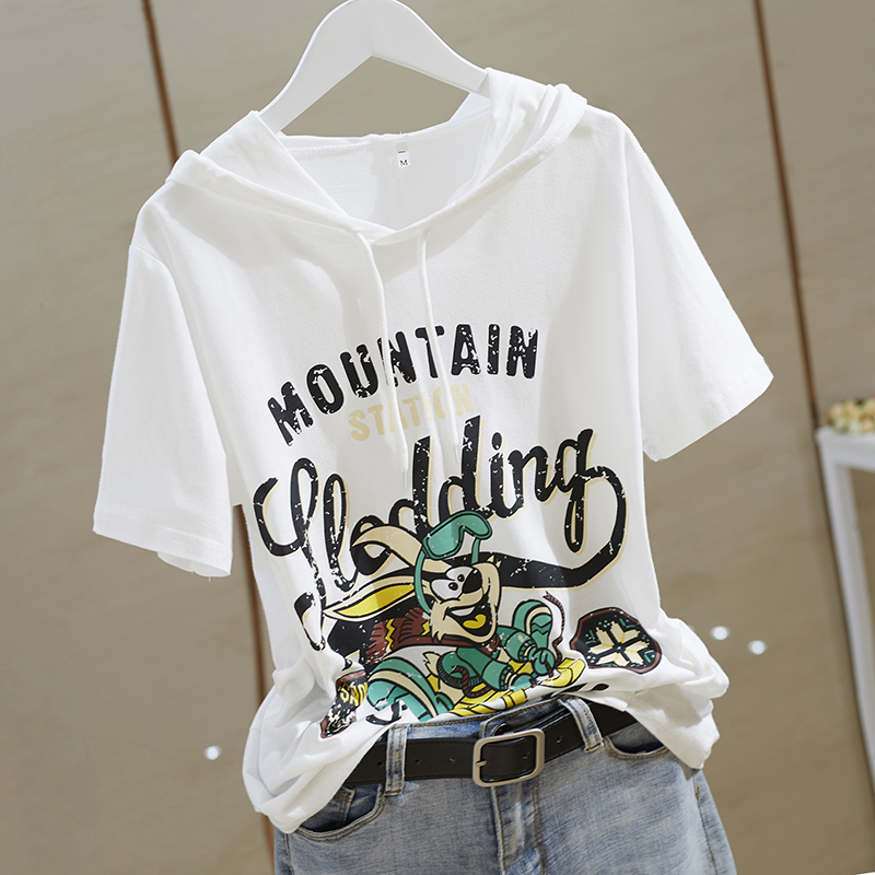 宽松大码 纯棉t恤女短袖 连帽白色体恤上衣潮显瘦潮t 新款 2025年夏季