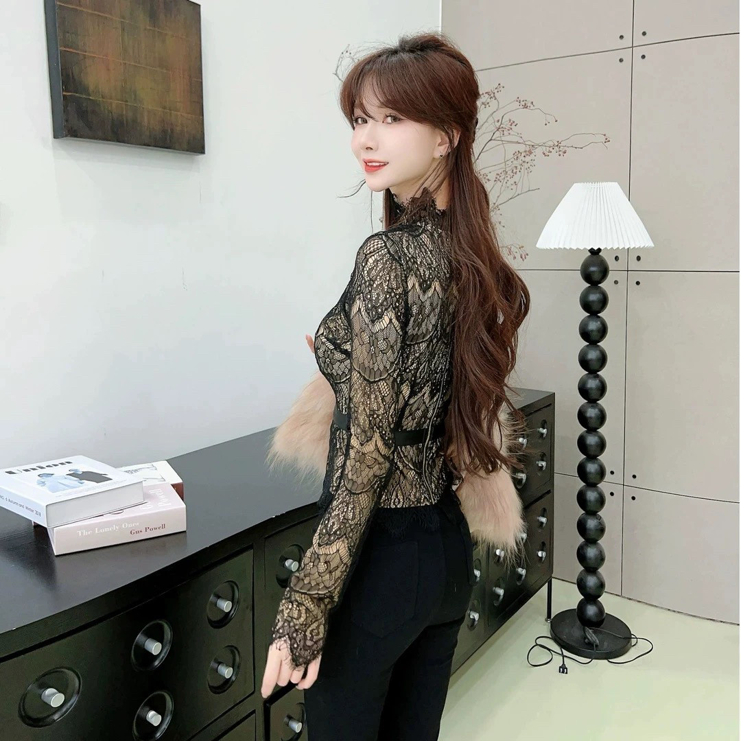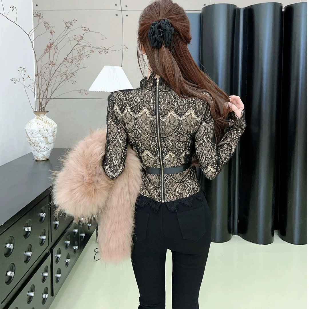 拉链修身 性感镂空睫毛蕾丝打底衫 显瘦上衣 官方旗舰店正品 卡卡女装