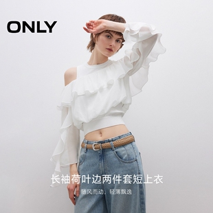 新款 ONLY2026春季 无袖 针织背心荷叶边短款 上衣女 蕾丝衫 两件套