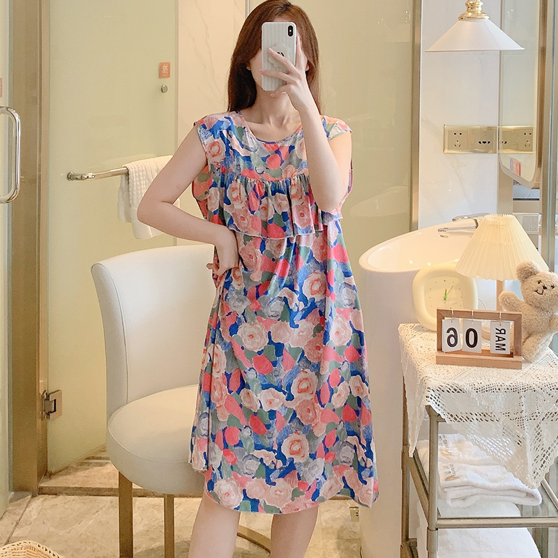 家居人造棉加长连衣裙 棉绸复古蝴蝶印花中袖 新中式 国风睡裙女夏季