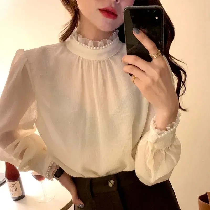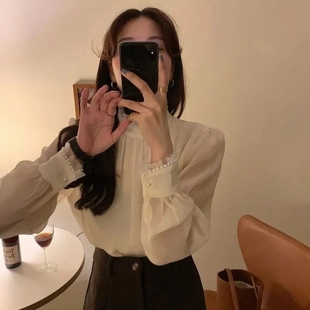 韩国chic甜美优雅立领珍珠拼接雪纺上衣微透宽松百搭泡泡袖 女 衬衫