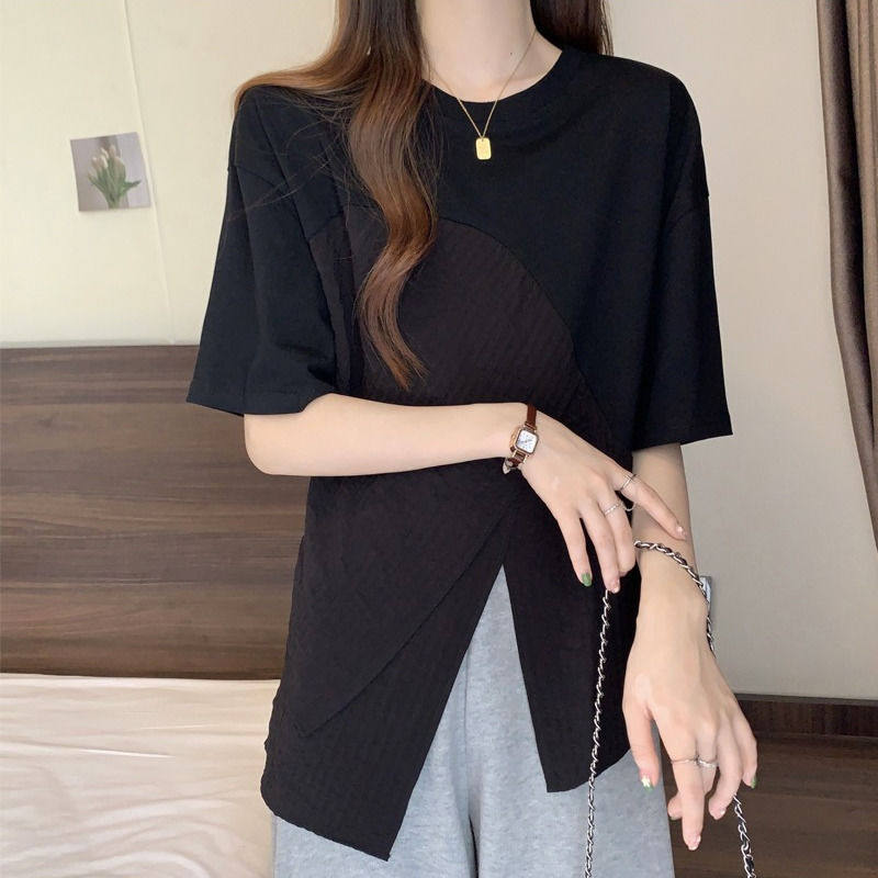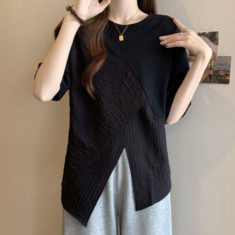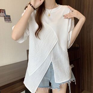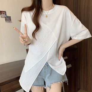 新款 不规则T恤夏装 体恤胖mm宽松显瘦遮肚子正肩上衣 女装 300斤大码
