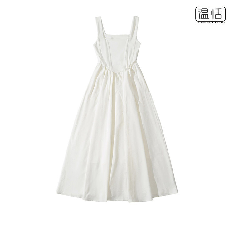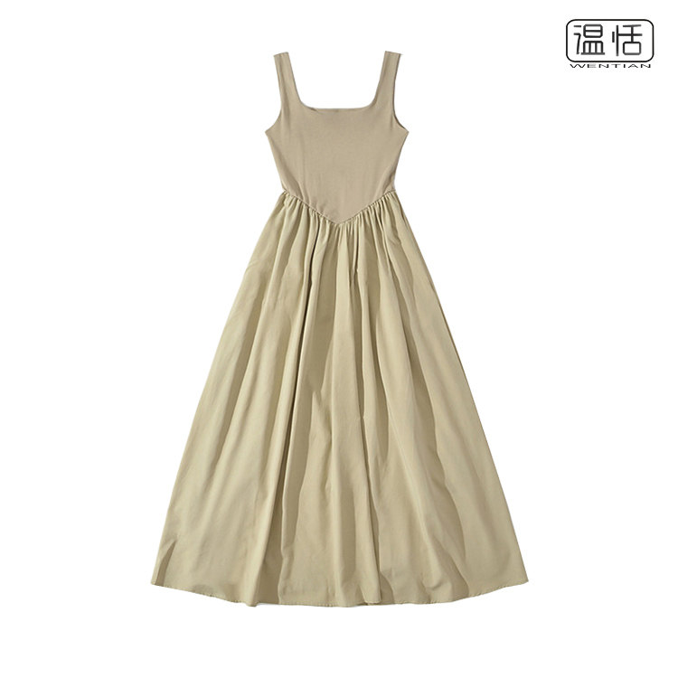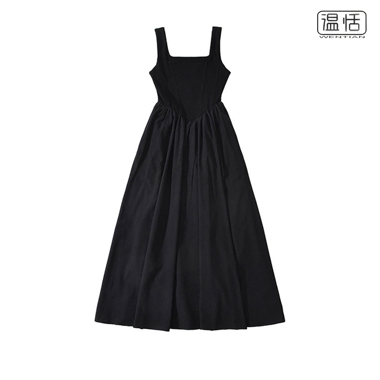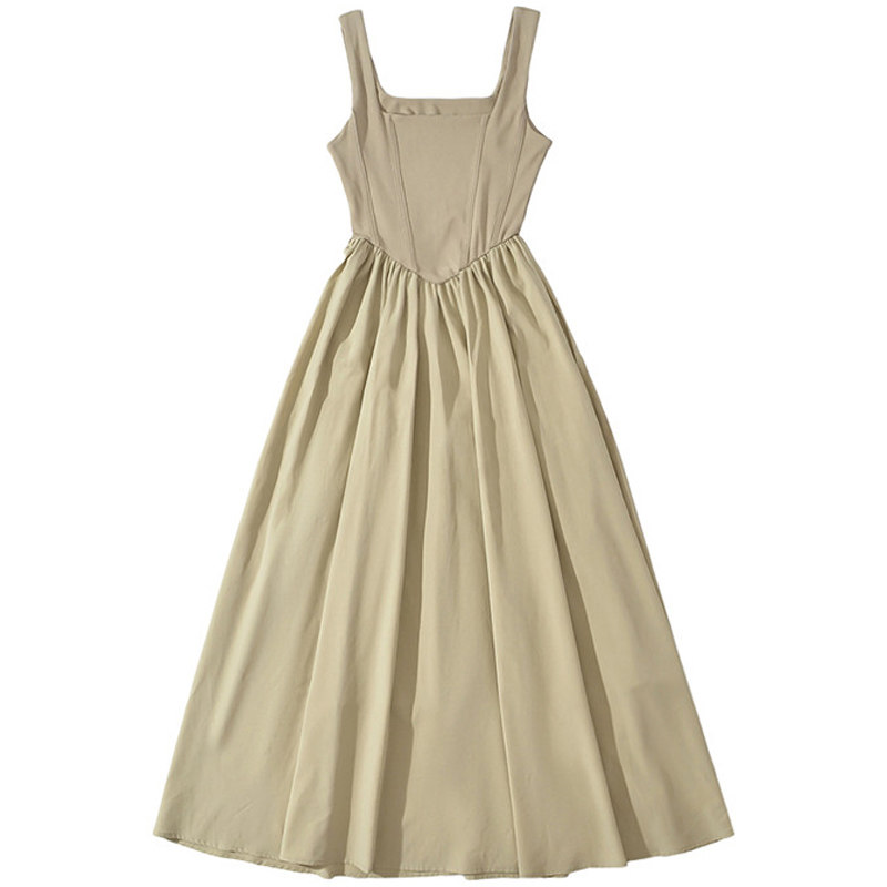 纯欲方领宽肩带背心长裙鱼骨收腰气质显瘦A字吊带连衣裙 包邮