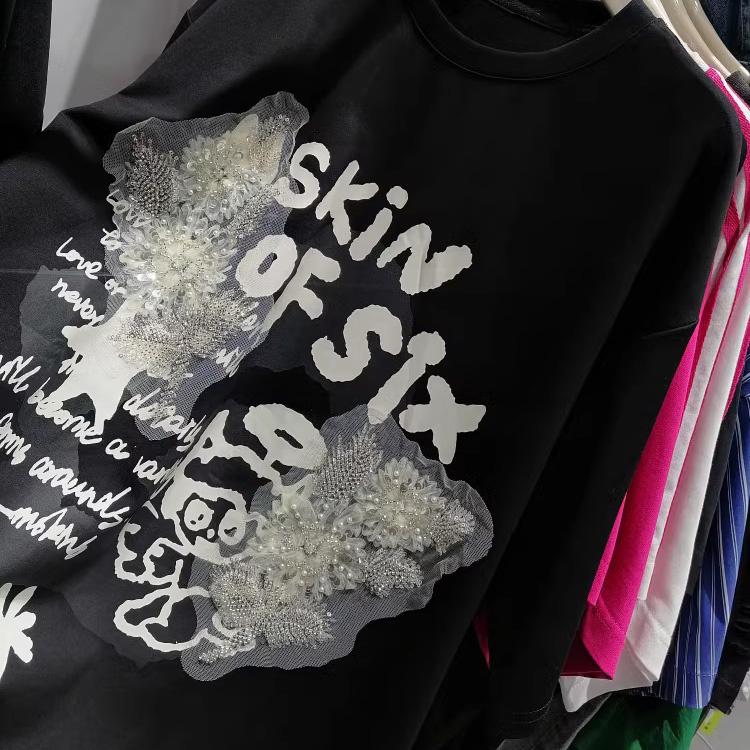 潮牌女装 欧货高端正版 重工镶钻钉珠宽松阔版 T恤圆领短袖 休闲大版
