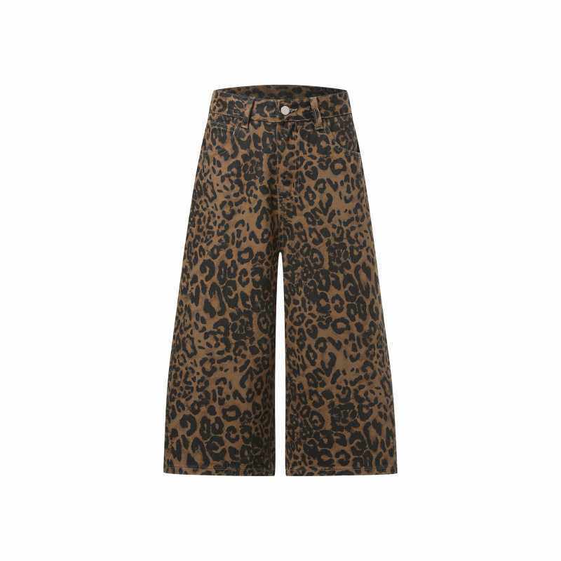 女春夏季 豹纹高腰阔腿牛仔七分裤 美式 辣妹显瘦直筒裤 包邮