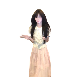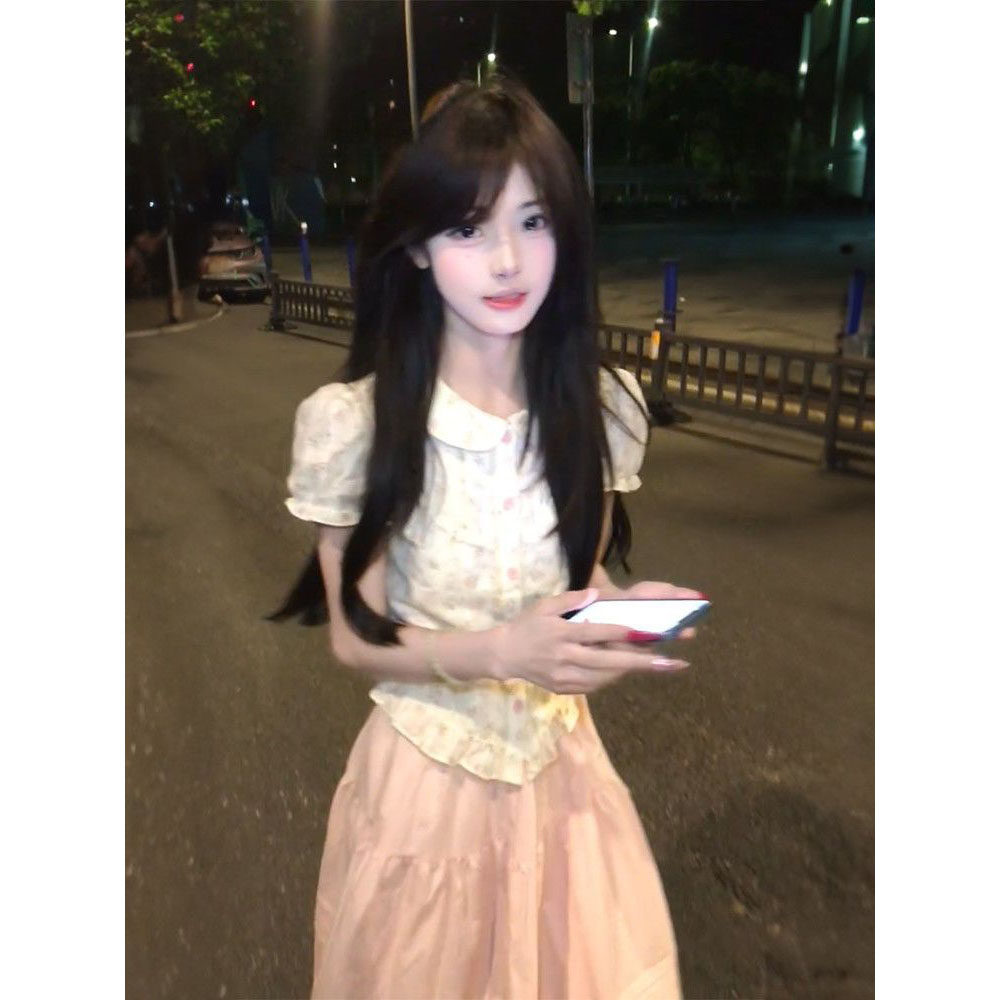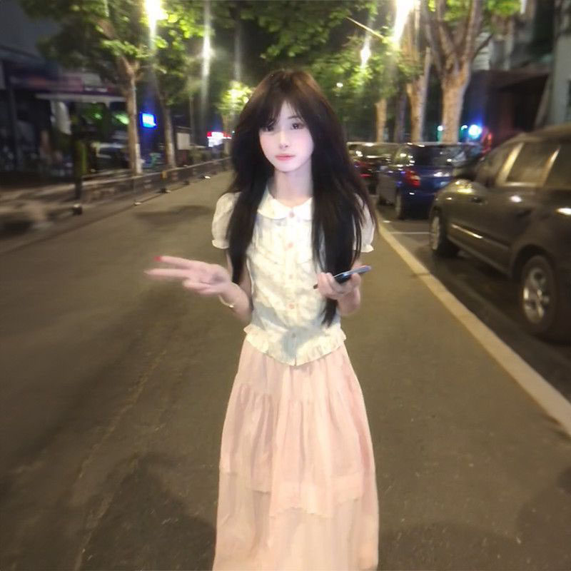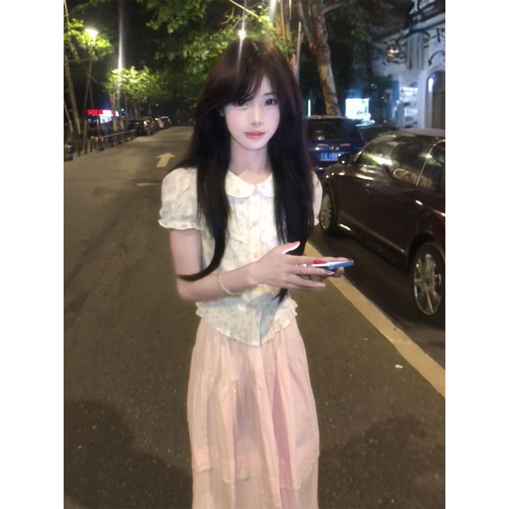 娃娃领衬衫 减龄甜妹穿搭一整套短袖 高腰超仙粉色半身裙 时尚 夏季