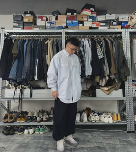 双色水洗磨毛长袖 几立 牛仔衬衫 夕阳倒映在蓝色天际