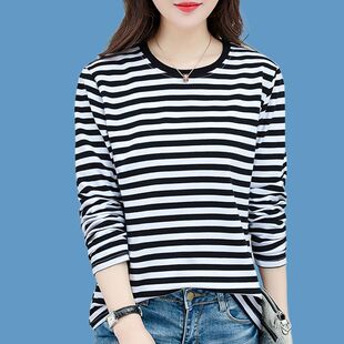 宽松减龄上衣圆领显瘦打底衫 纯棉条纹长袖 T恤女2024秋季