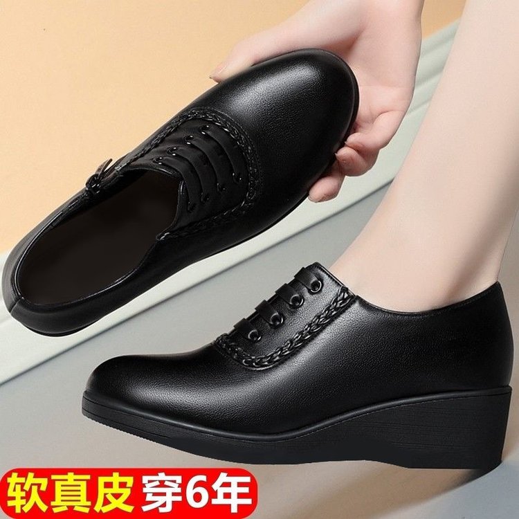 百搭皮鞋 大东厚真皮新款 时尚 中年软底舒适妈妈坡跟防滑女单鞋 女鞋