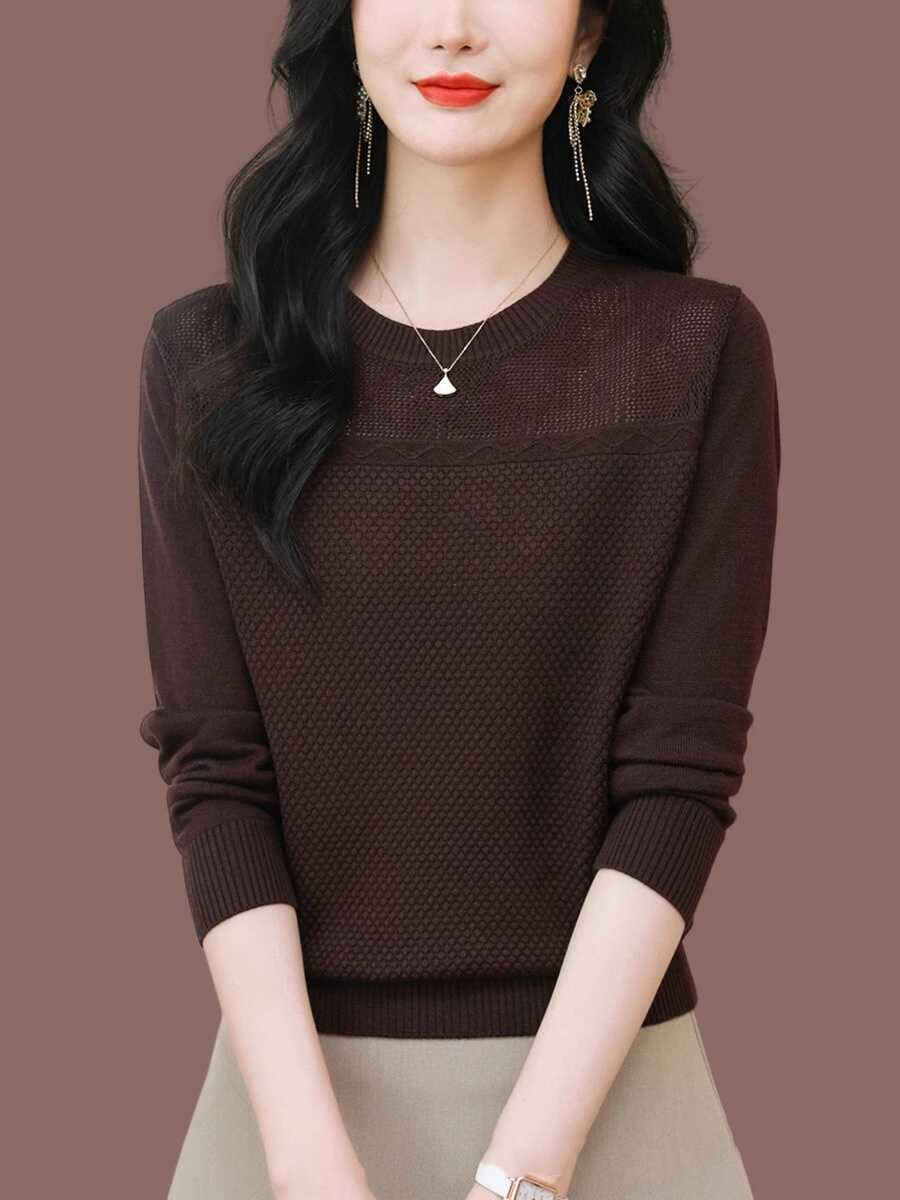 镂空羊毛针织衫 女装 春秋妈妈宽松上衣打底薄毛衣 t恤夏季 圆领长袖
