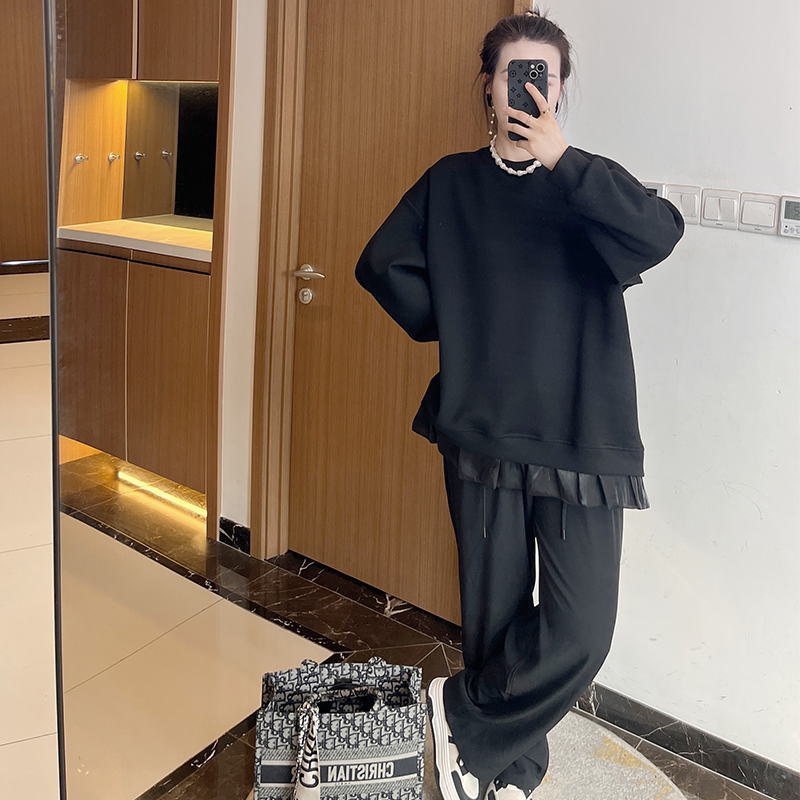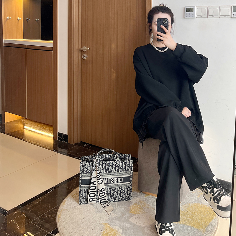 纸片人黑色中长款 连衣裙女气质宽松显瘦遮肚子高级感长裙T恤裙子