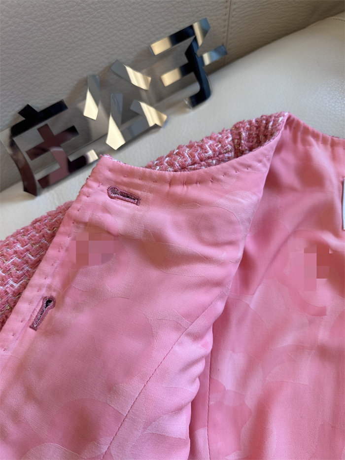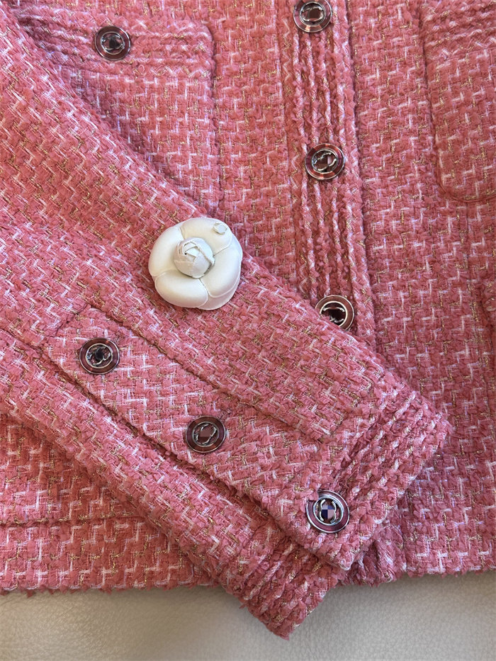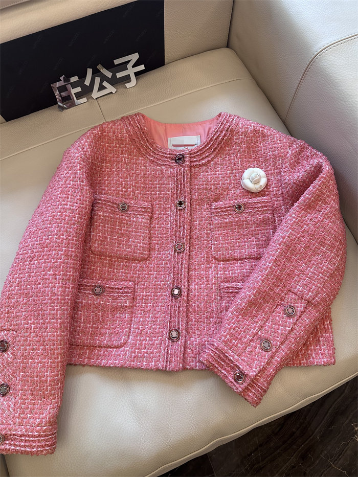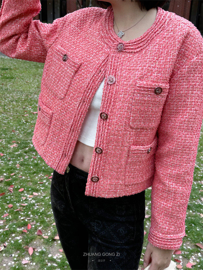 小香春夏预告系列粉色圆领溜肩宽松长袖 单排扣女短外套