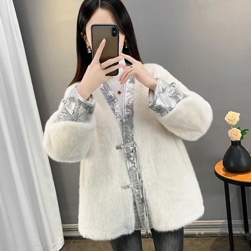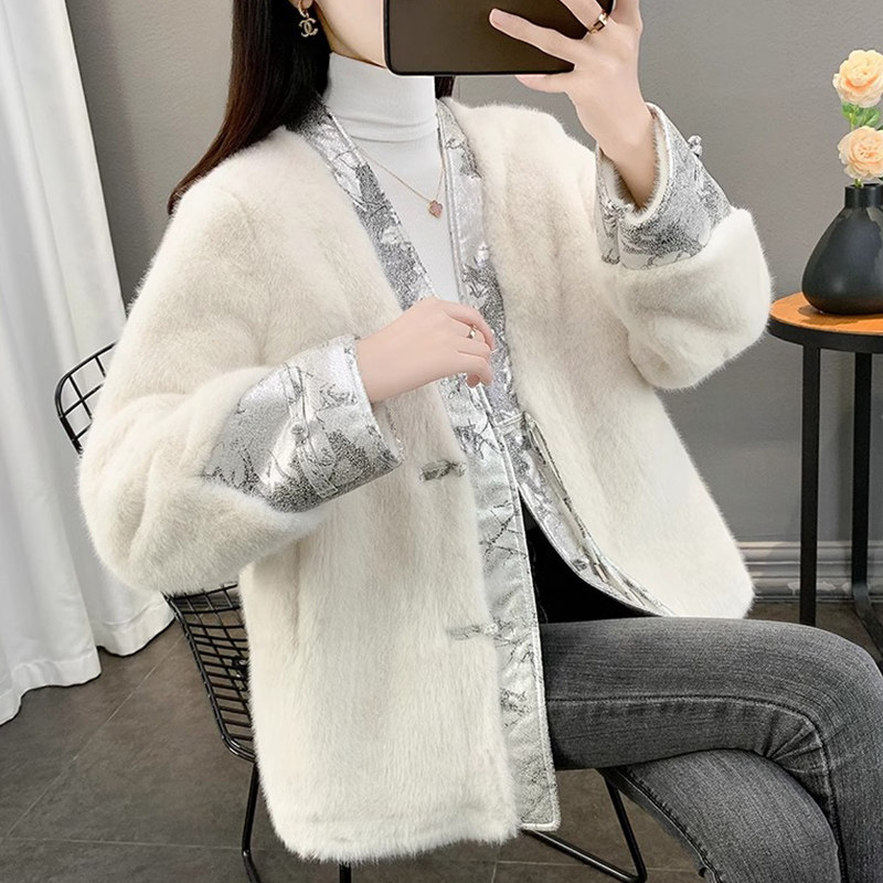 立领毛茸茸上衣 环保狐狸毛皮草外套女冬短款 双色晕染 月光浅金