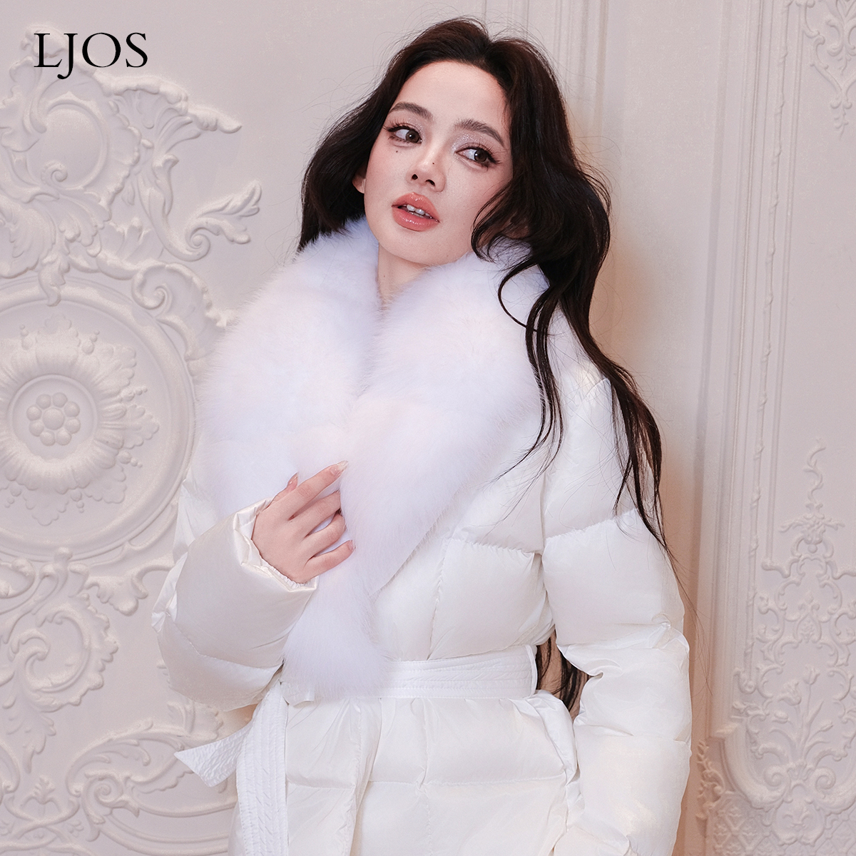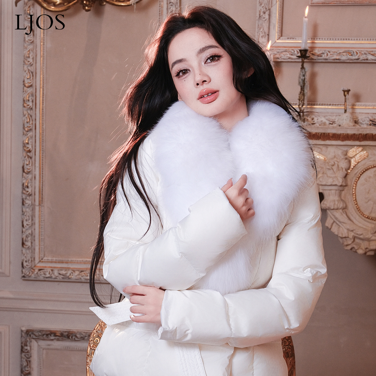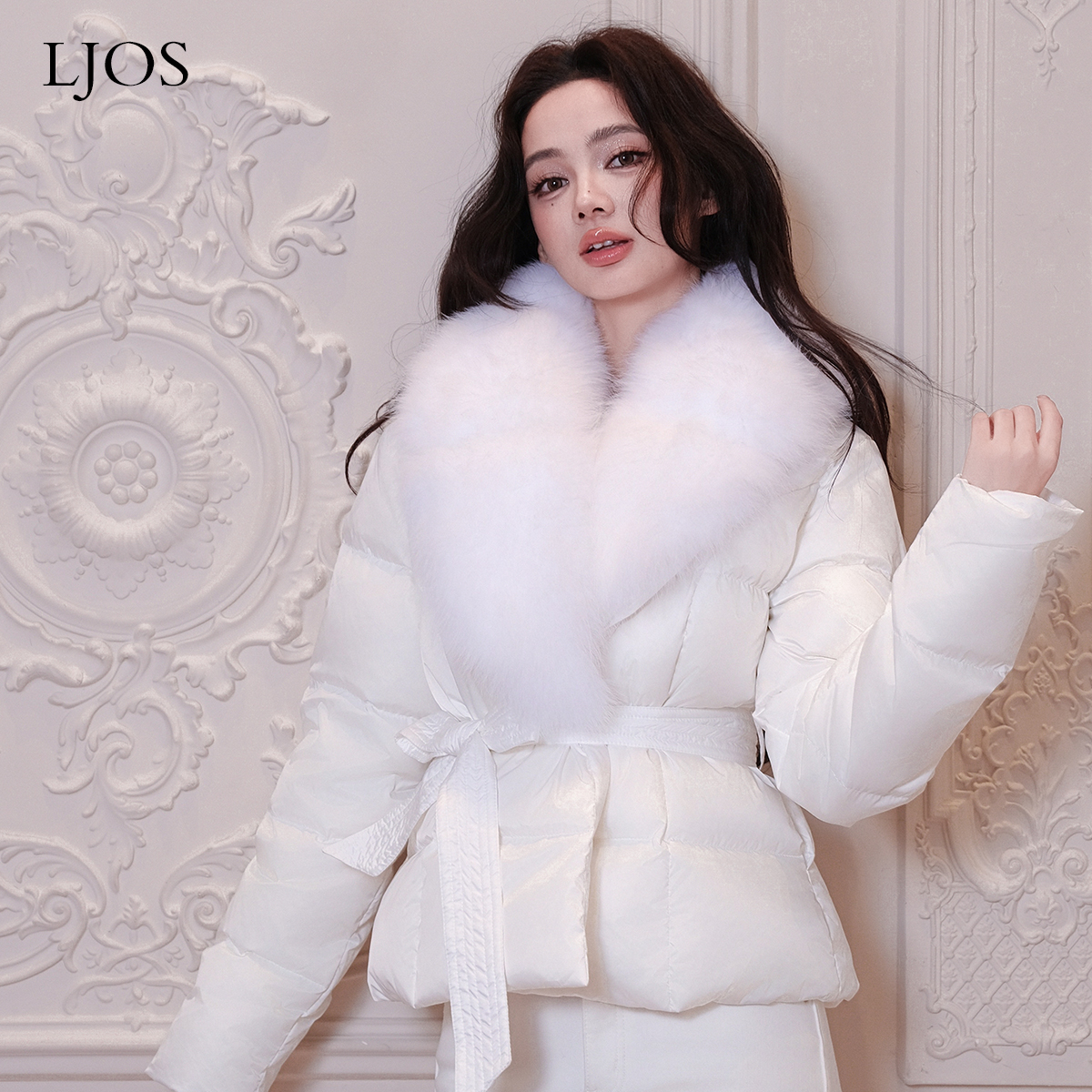 LJOS白雪公主毛领腰带羽绒服秋冬白色短款 外套保暖重工气质