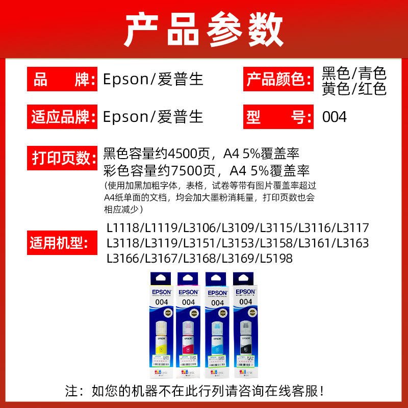 L3256 喷墨打印 L3115 墨水适用L3251 L3253 3116 L326X L3258 3119 爱普生Epson004原装 L1119 3118 L3108