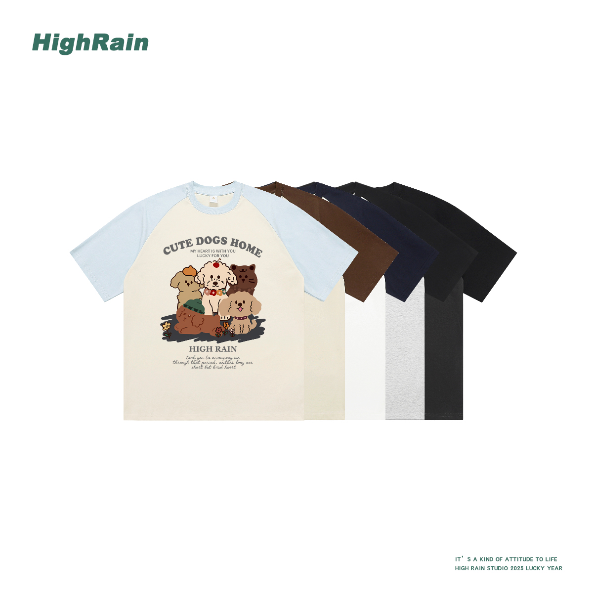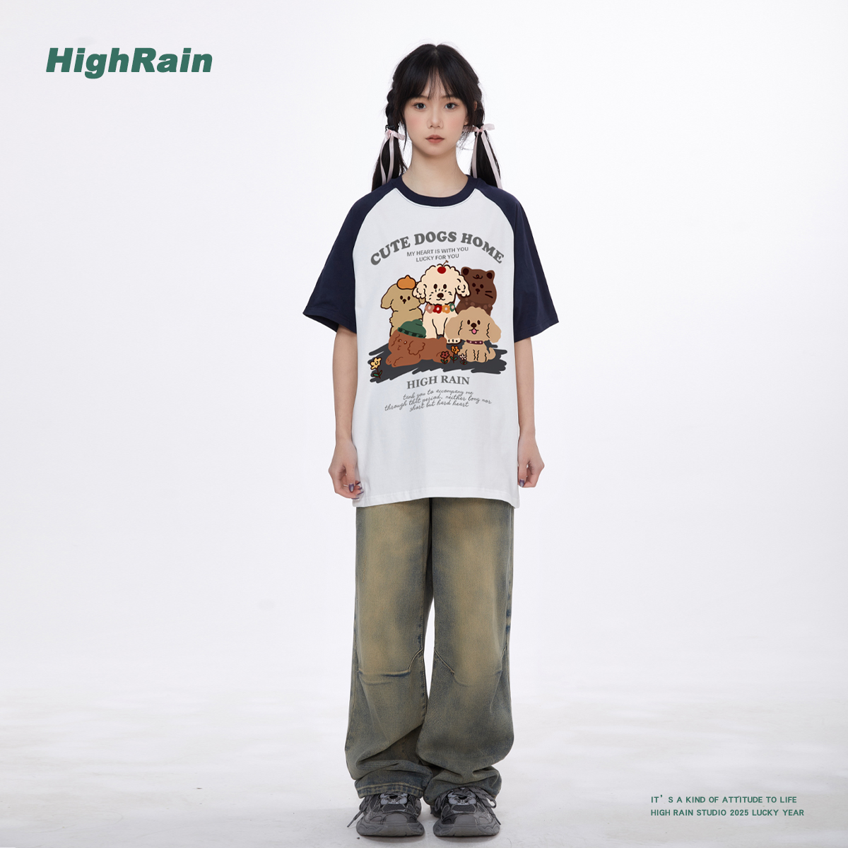 狗狗一家插肩短袖 新款 男女拼接T恤卡通百搭情侣上衣夏 rain high