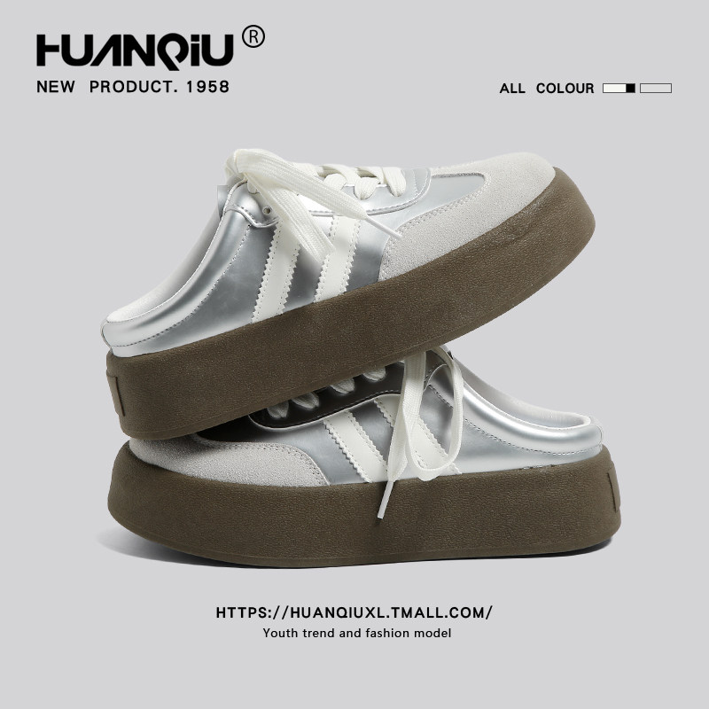 一脚蹬办公室德训女鞋 新款 女外穿2026春季 环球银色厚底包头半拖鞋
