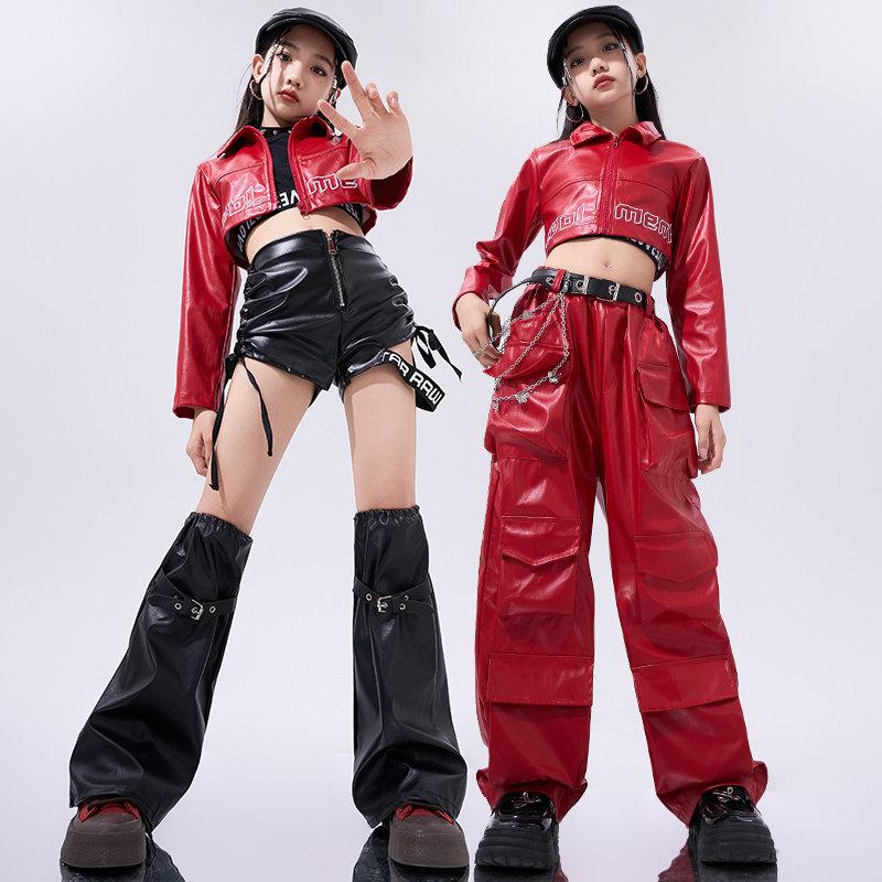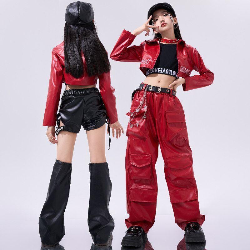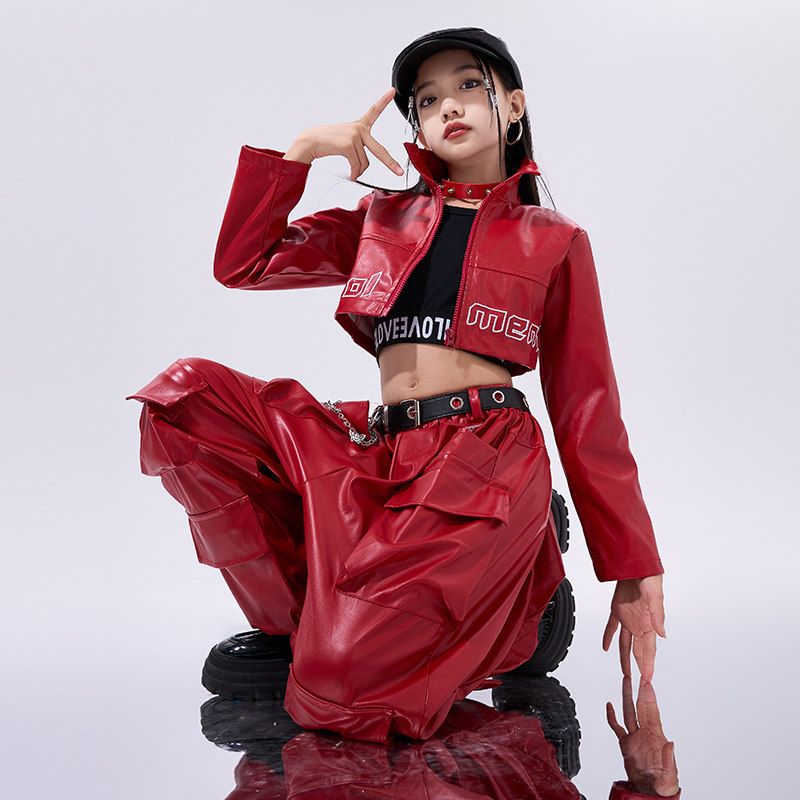 女童爵士舞潮酷时髦儿童走秀服女团风红色皮衣jazz舞蹈演出服套装