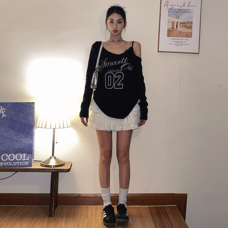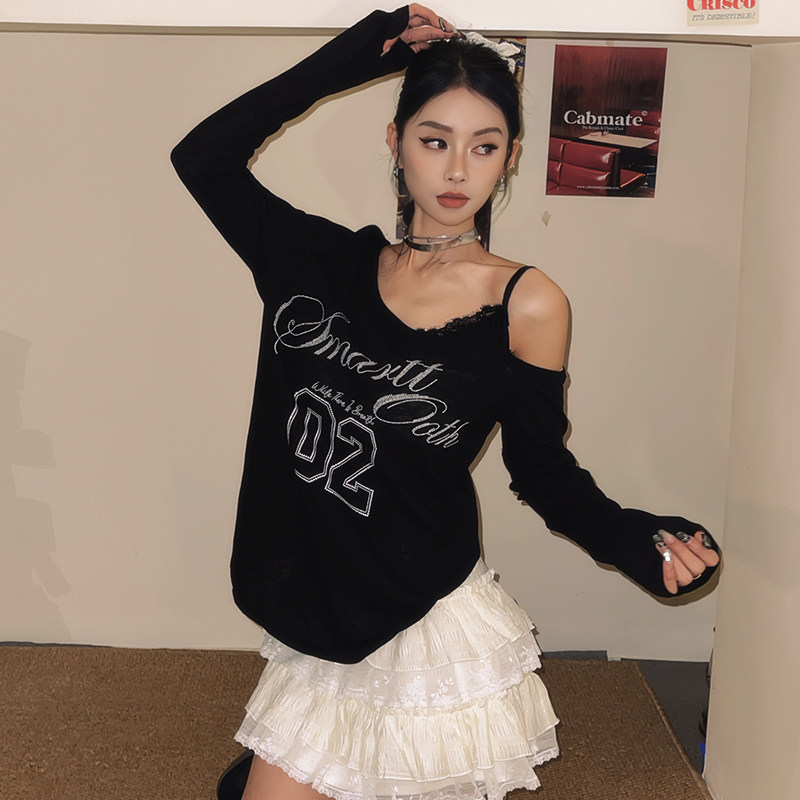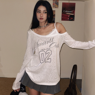 斜肩罩衫 DoubleD美式 新款 T恤女秋季 上衣潮 蕾丝吊带露肩设计感长袖