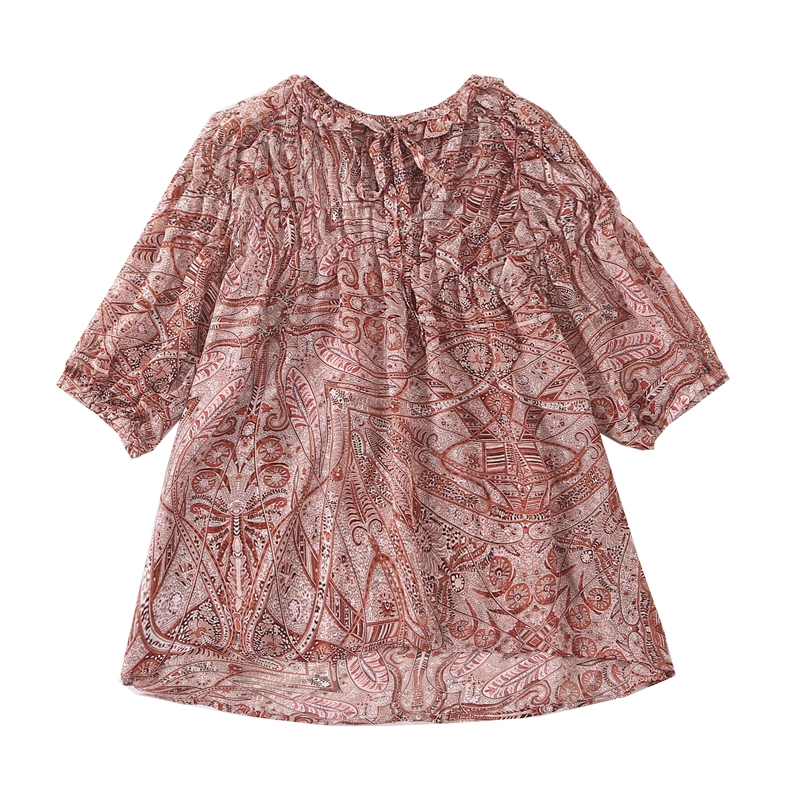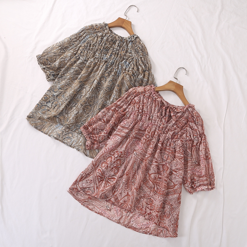 雪纺衫 夏季 薄款 优雅减龄圆领系带领印花短袖 上衣女23216 新款