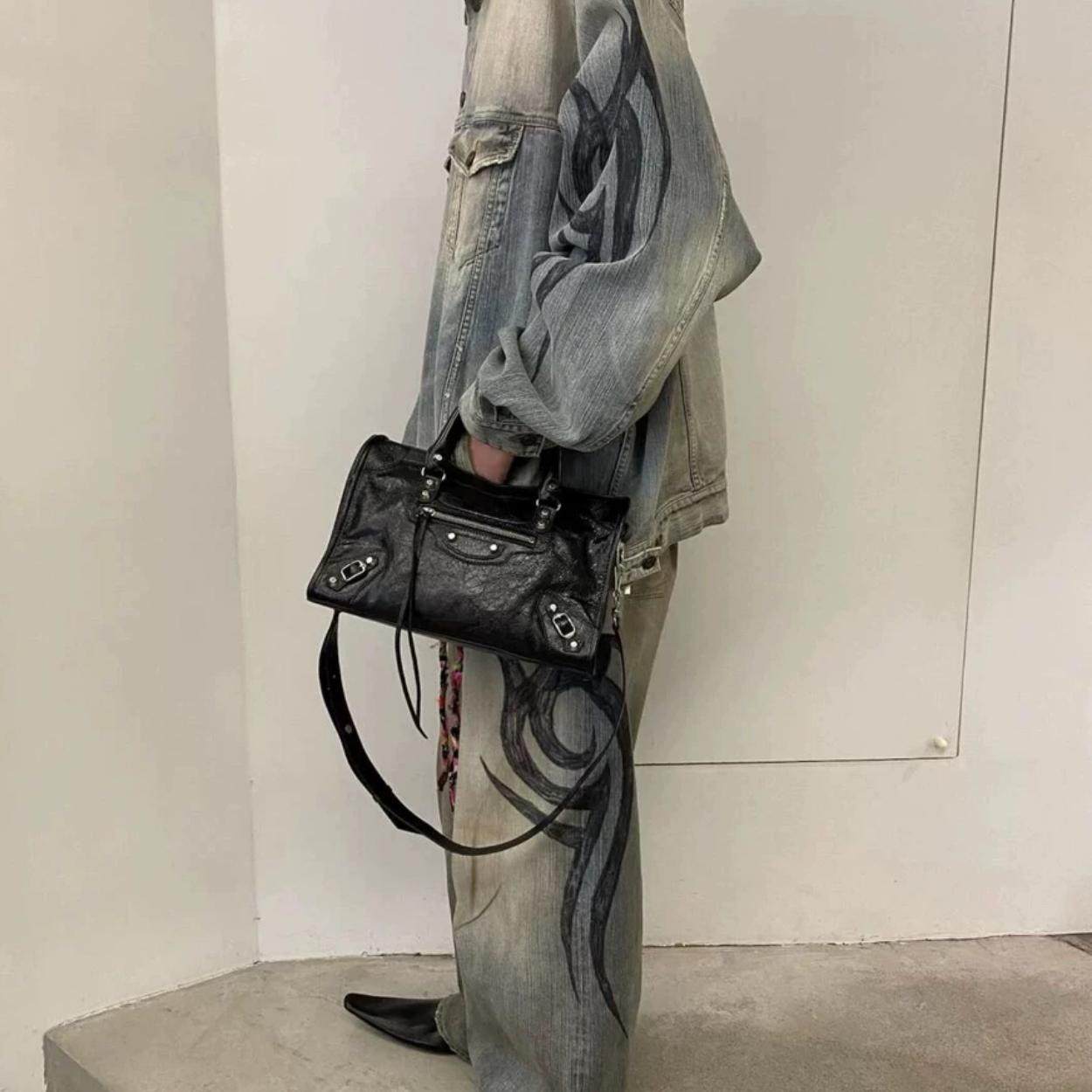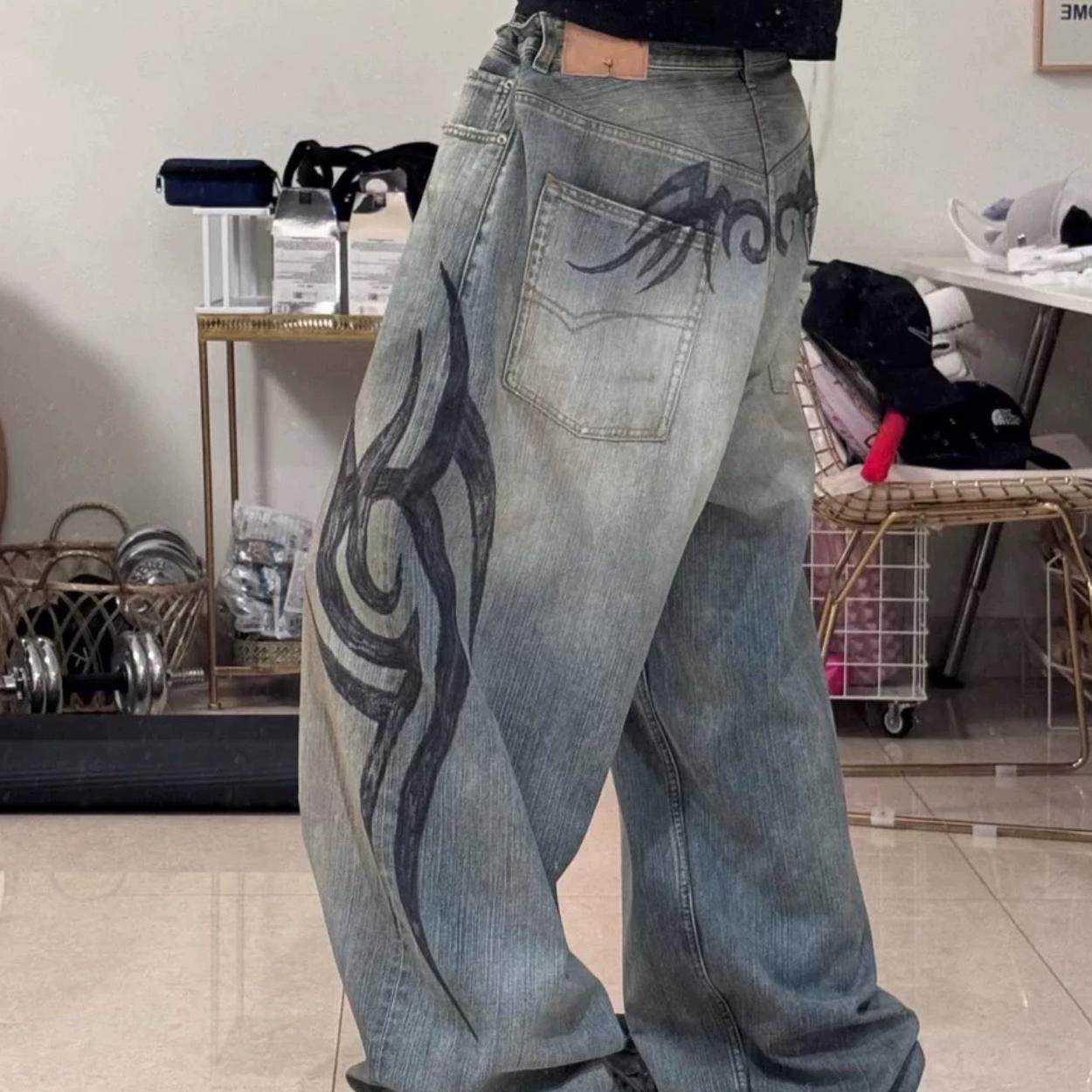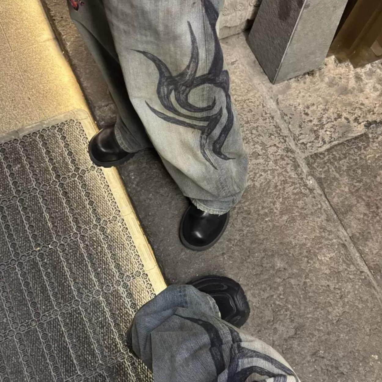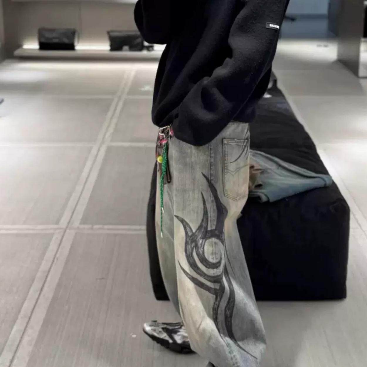 竹节纹baggy抽绳水洗破坏牛仔裤 性价比 Y2K 龙纹图腾印花 24FW