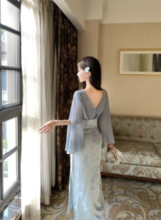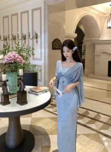 新中式 月芙 清冷感蓝色改良旗袍收腰温柔国风连衣裙 Mimo